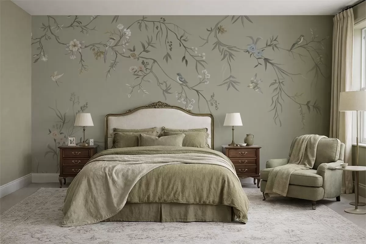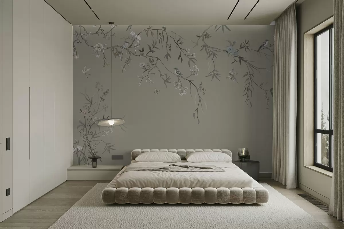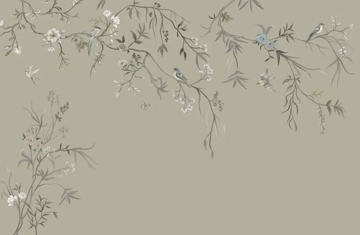 Fototapet Model floral cu păsări pe fundal rece Nr. w05127v6