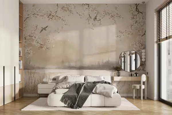 Fototapet Ramuri delicate înflorite lângă lac, cu păsări în ceață ușoară Nr. w05155