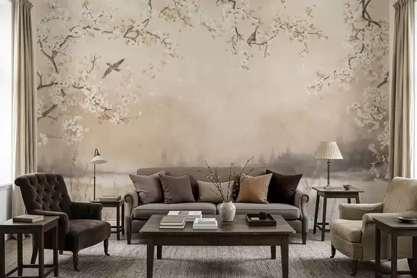 Fototapet Ramuri delicate înflorite lângă lac, cu păsări în ceață ușoară Nr. w05155