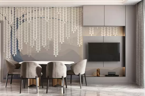 Fototapet salcie stilizată cu frunze atârnate pe fundalul unor munți minimalisti în nuanțe de bej și albastru-verde Nr. w05232