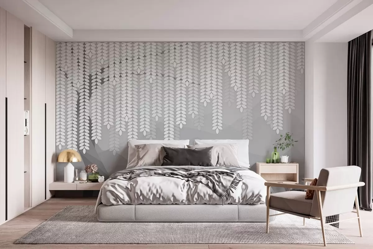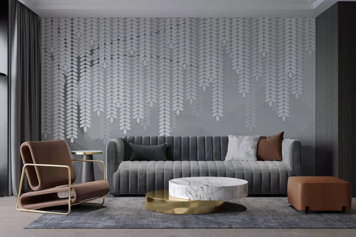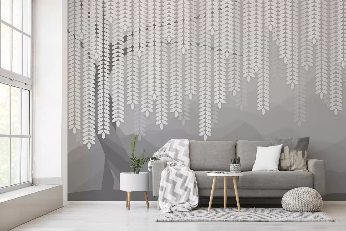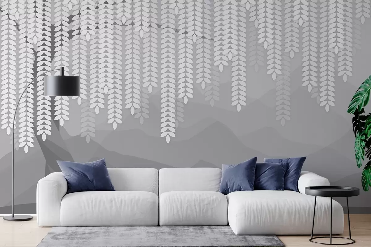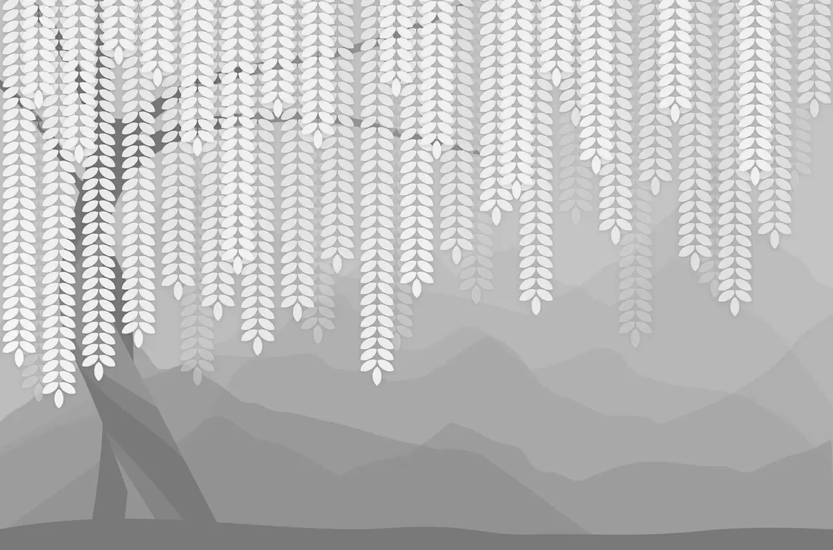 Fototapet salcie stilizată cu frunze atârnate pe fundalul unor munți minimalisti în nuanțe de gri Nr. w05232v3
