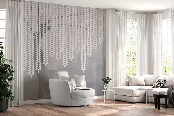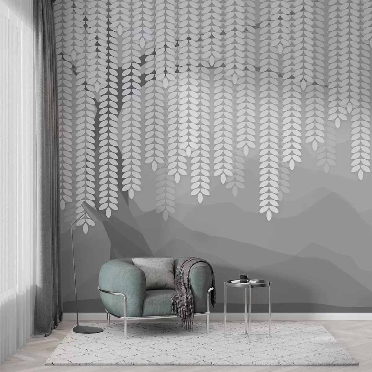 Fototapet salcie stilizată cu frunze atârnate pe fundalul unor munți minimalisti în nuanțe de gri Nr. w05232v3