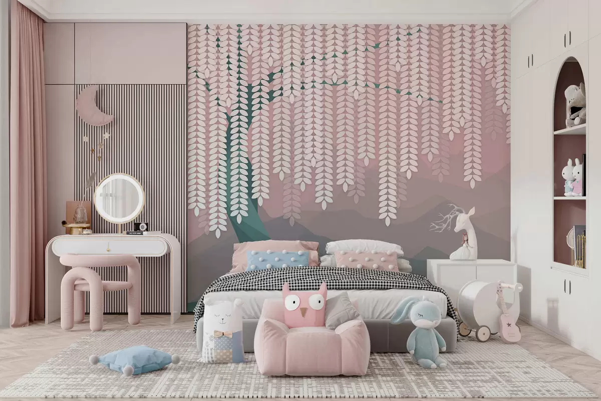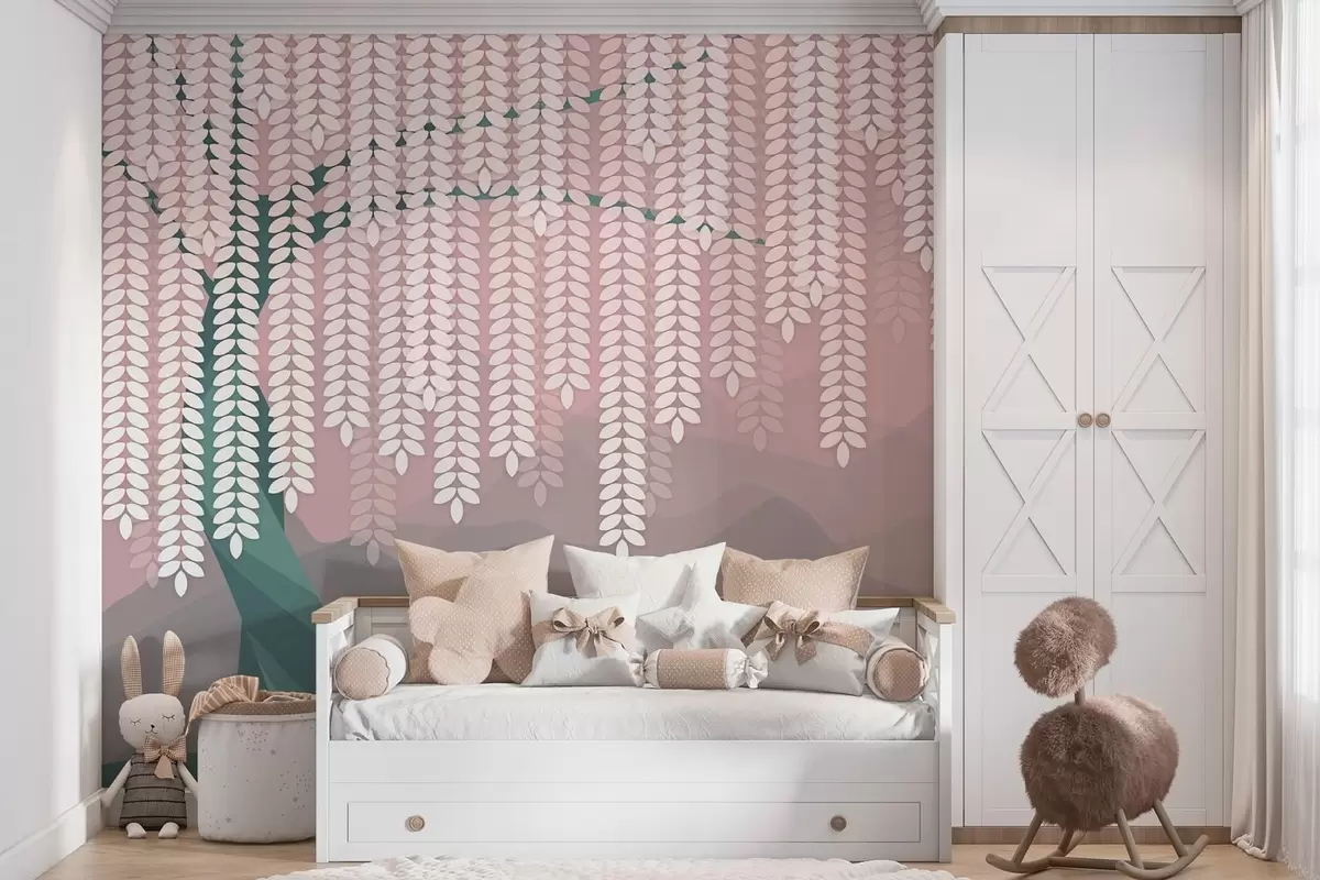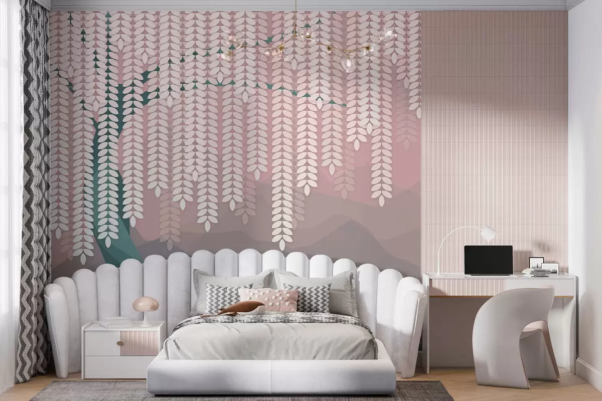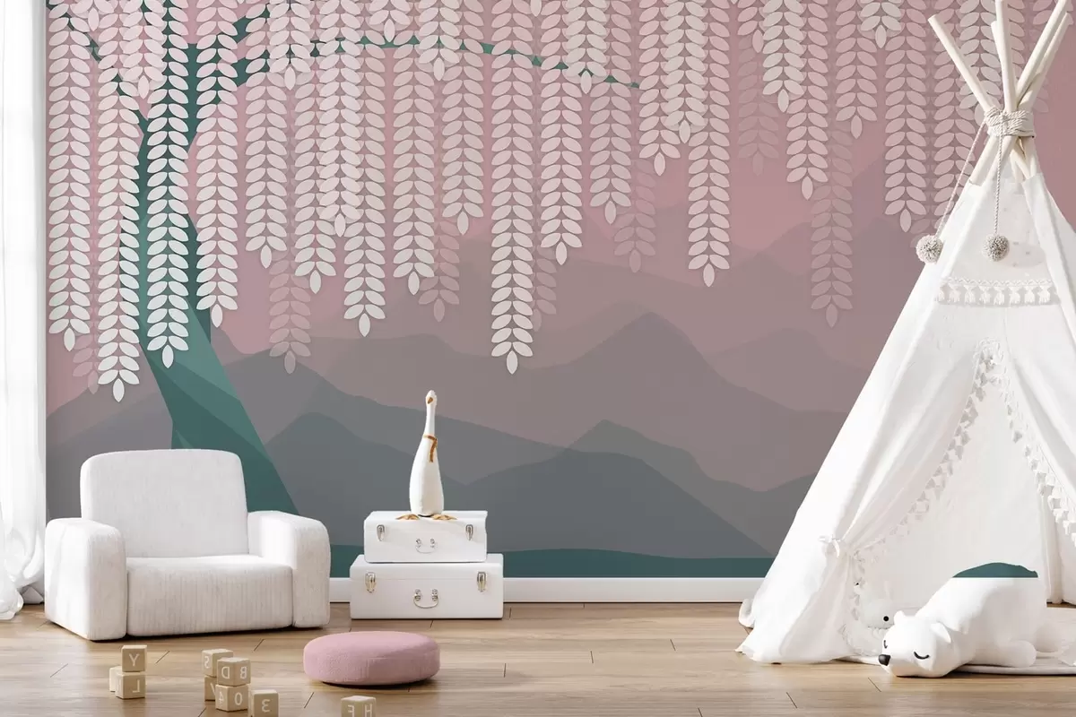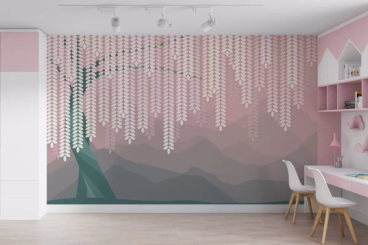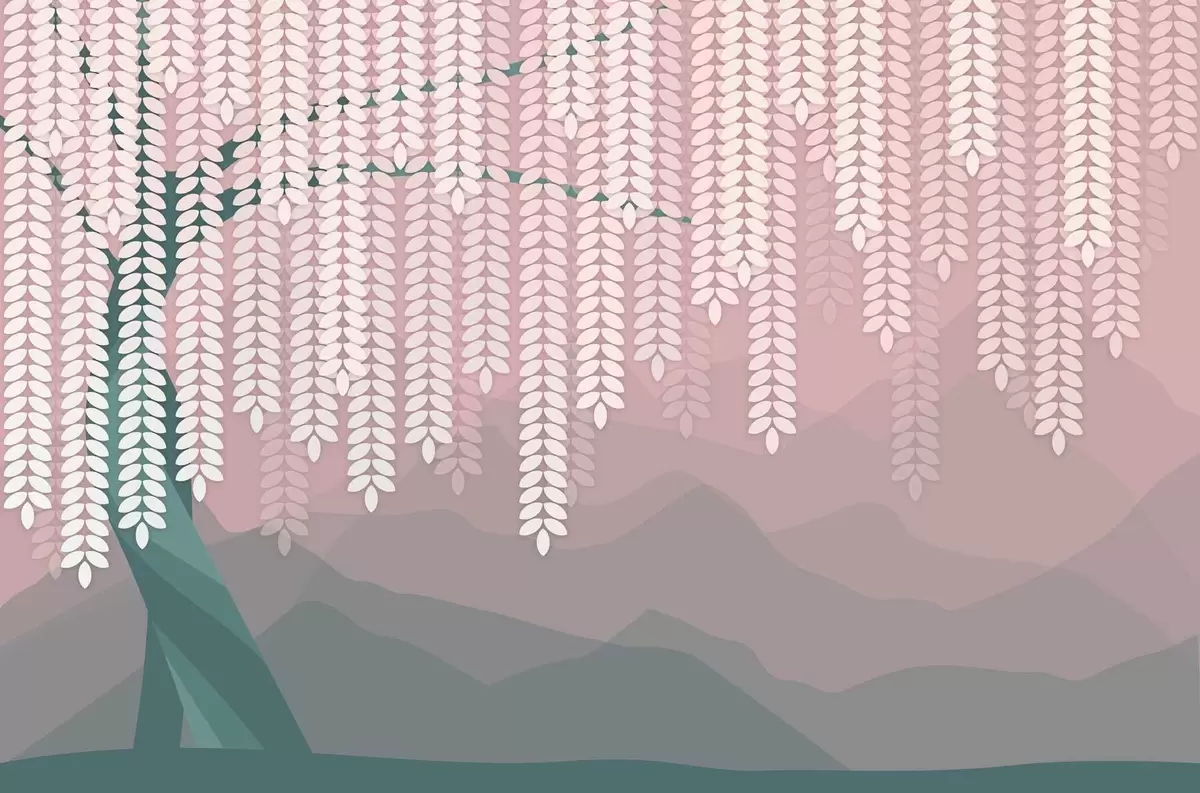 Fototapet salcie stilizată cu frunze atârnate pe fundalul unor munți minimalisti în nuanțe de roz și verde închis Nr. w05232v4