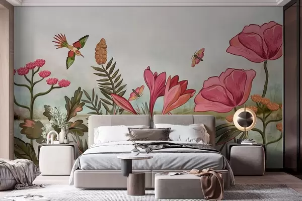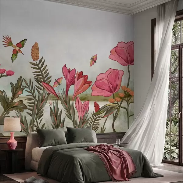 Fototapet Flori strălucitoare cu păsări și fluturi Nr. w05321
