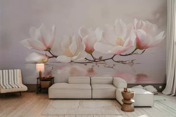Fototapet Ramură de magnolie cu flori deasupra reflexiei apei liniștite Nr. w05353v1