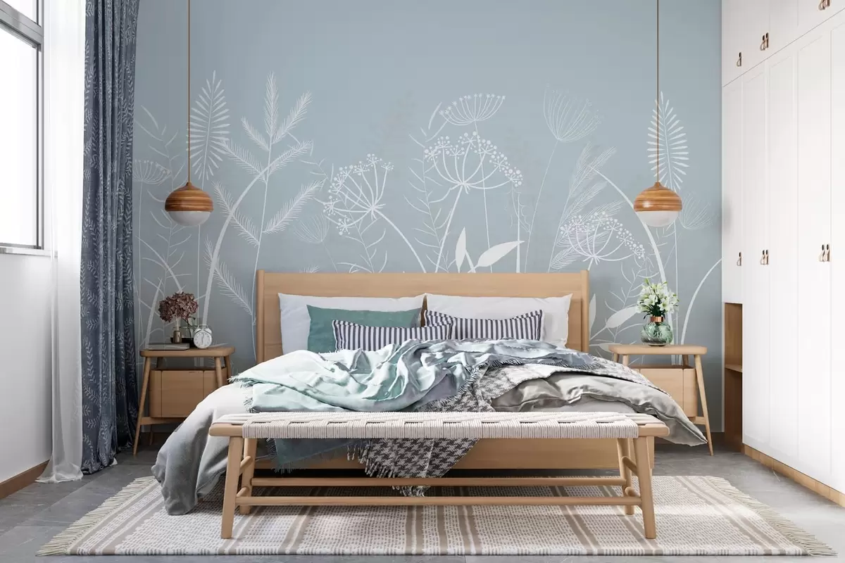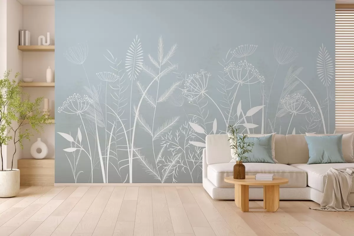 Fototapet ierburi sălbatice și flori delicate, pictate manual, pe un fundal gri-albastru Nr. w05383