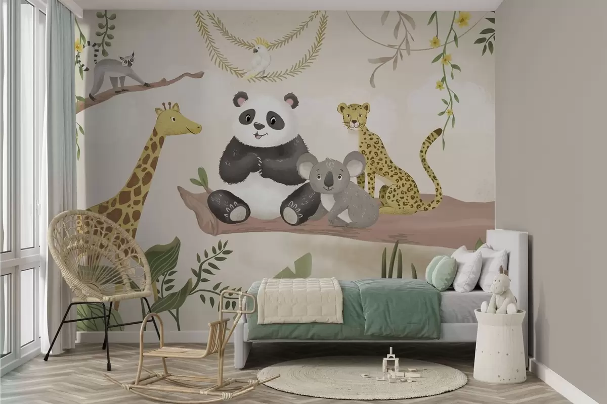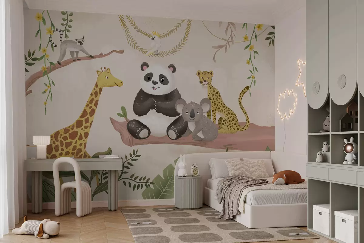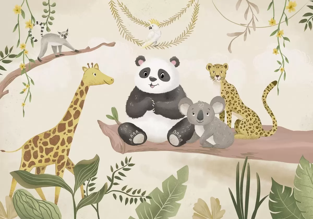 Fototapet Animale drăguțe din junglă, așezate pe o creangă printre plante Nr. w05393