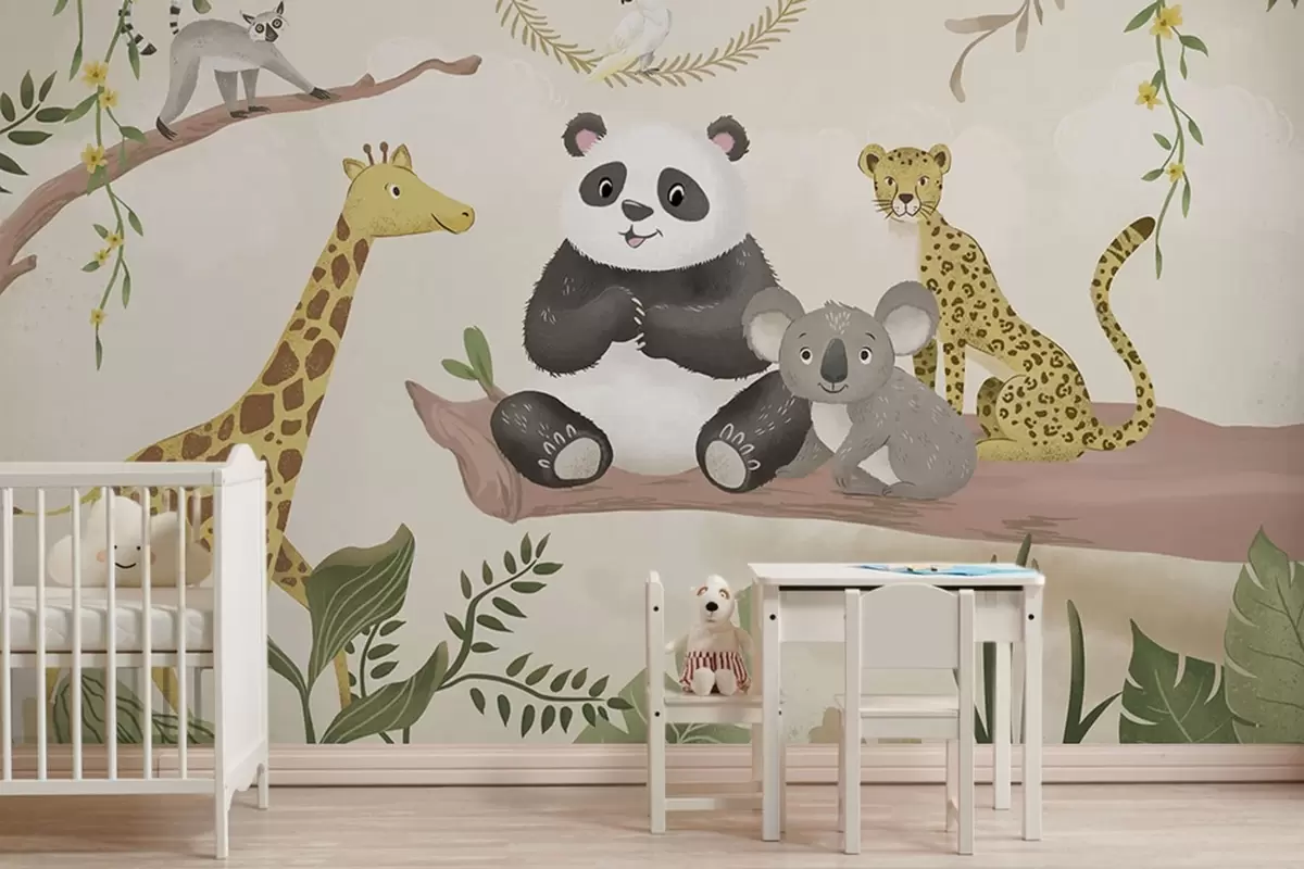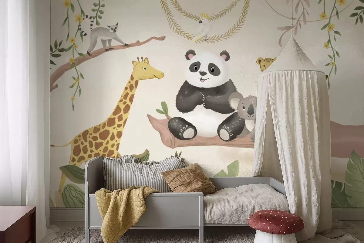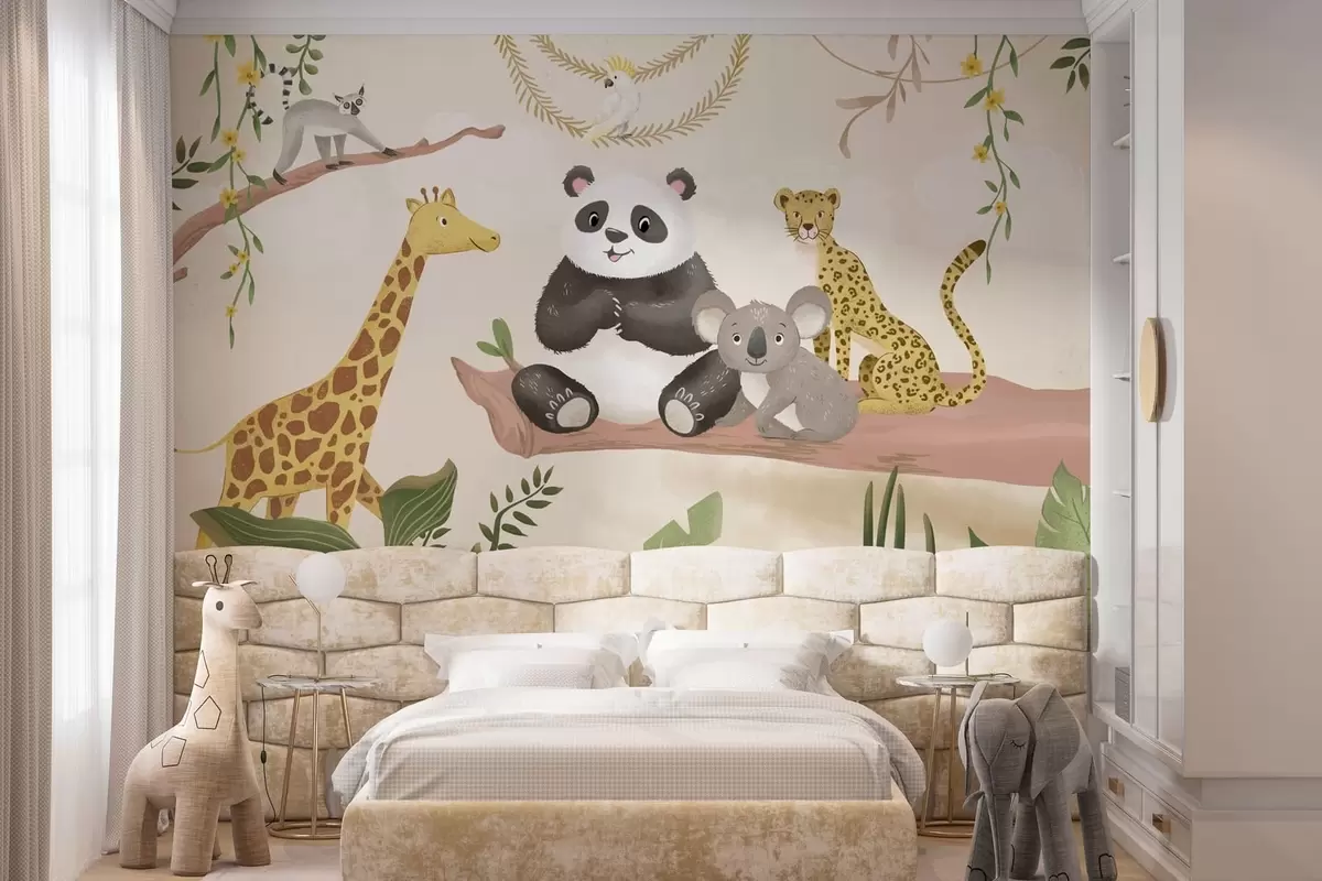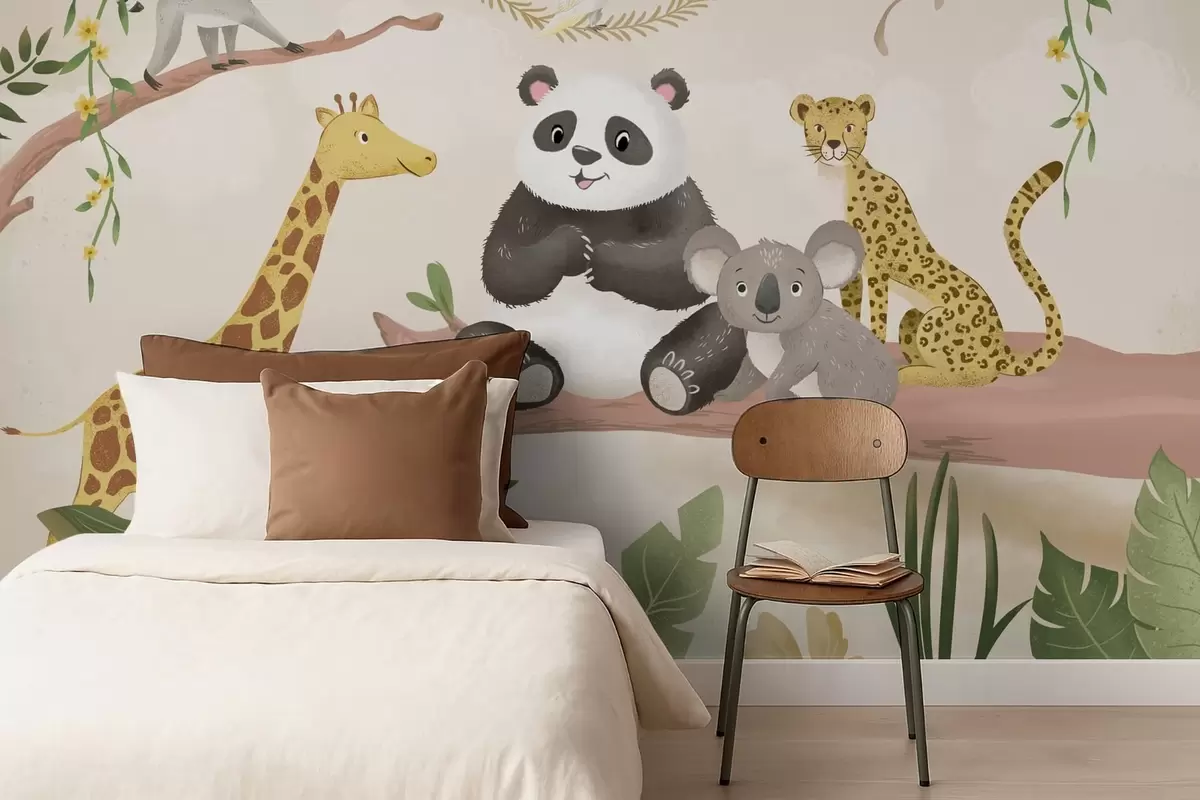 Fototapet Animale drăguțe din junglă, așezate pe o creangă printre plante Nr. w05393