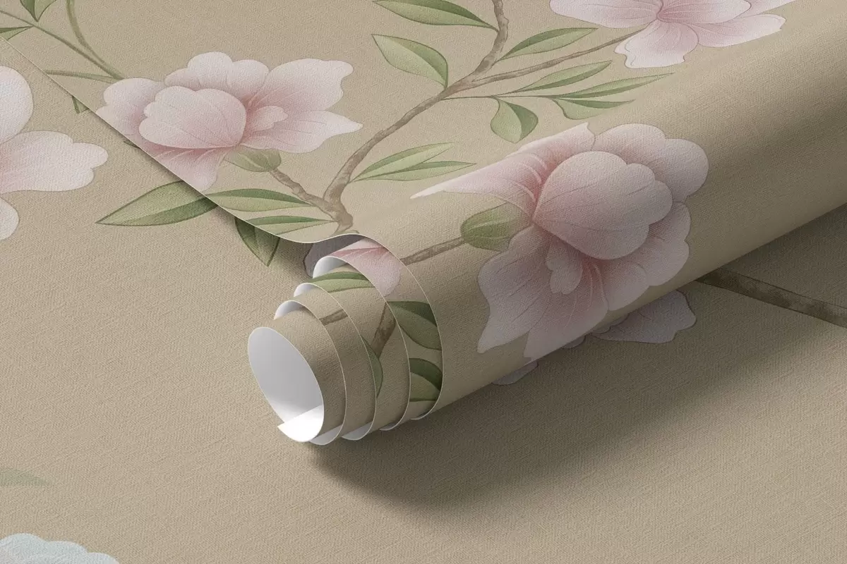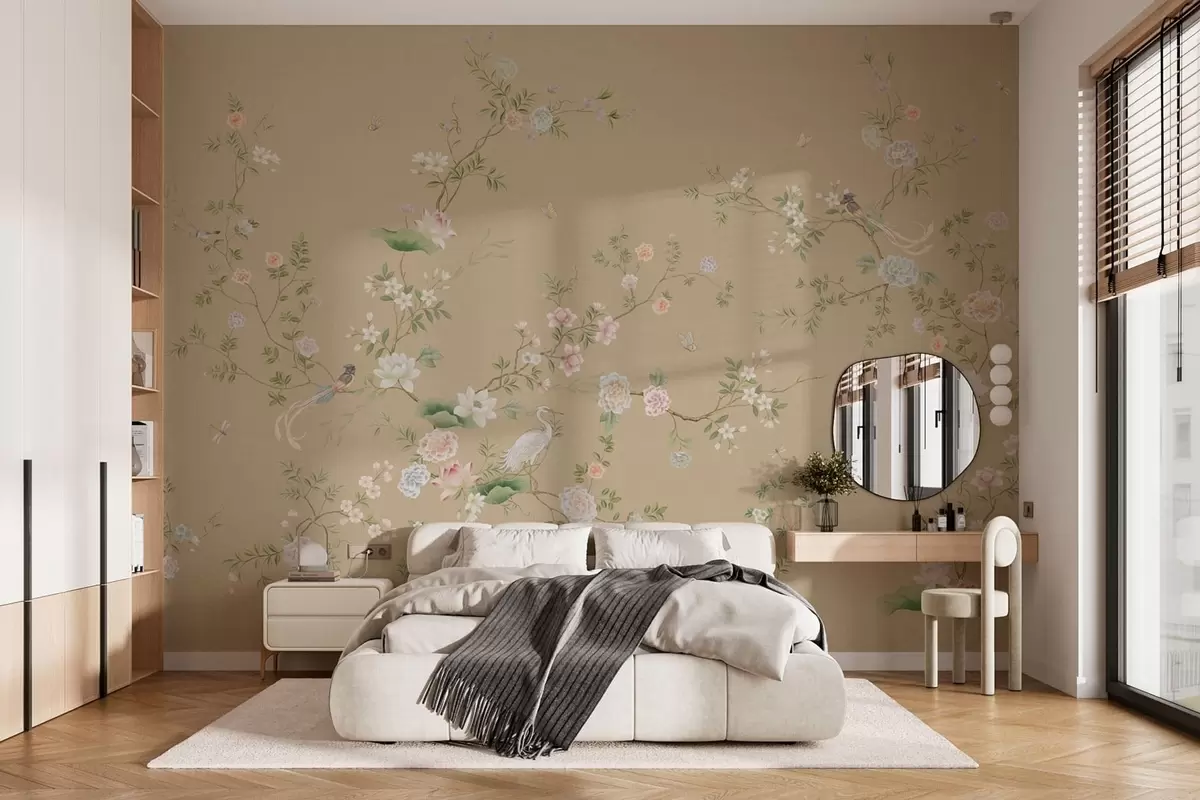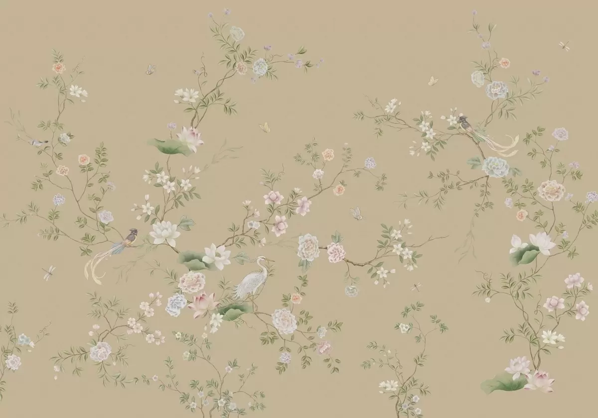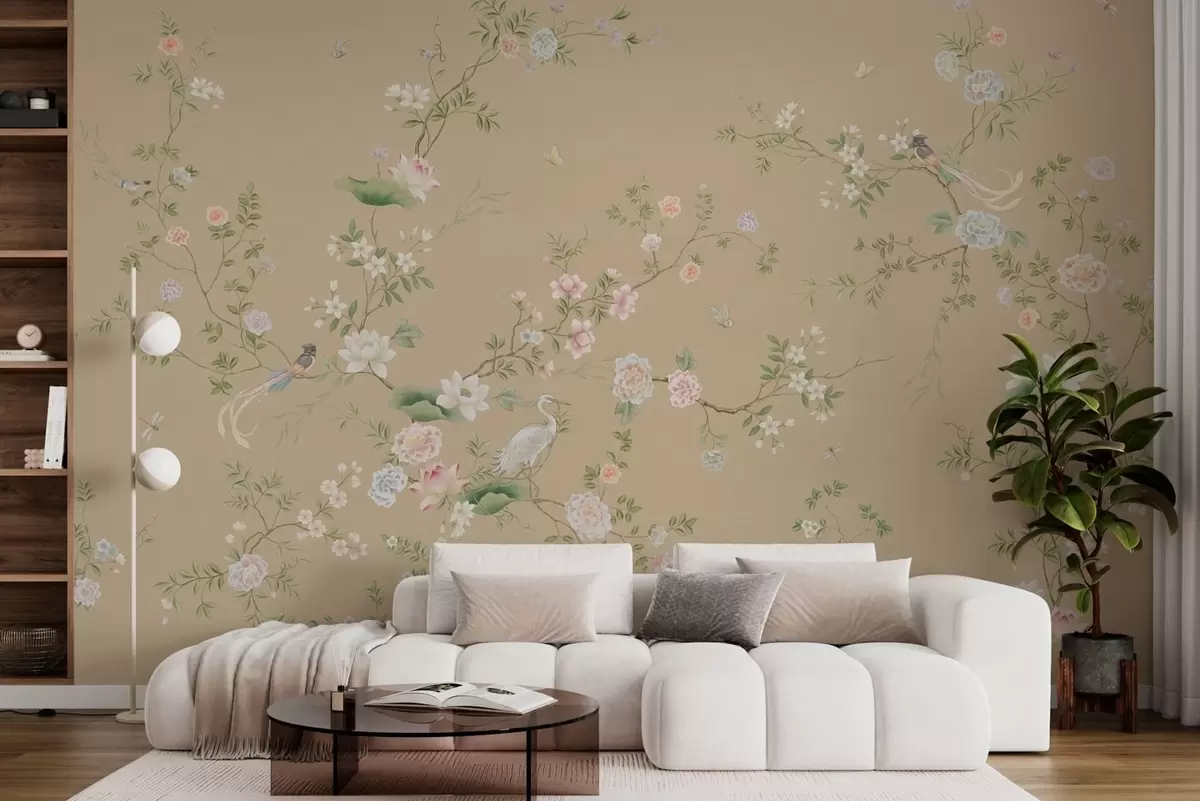 Fototapet Ramuri înflorite cu păsări pe un fundal bej cald Nr. w05416v2