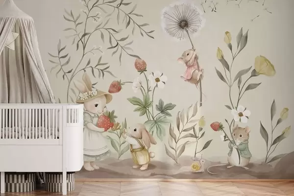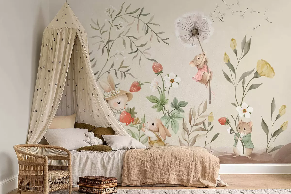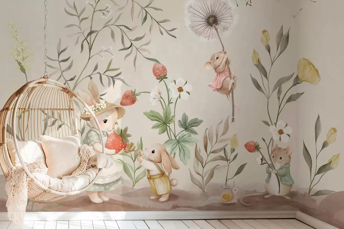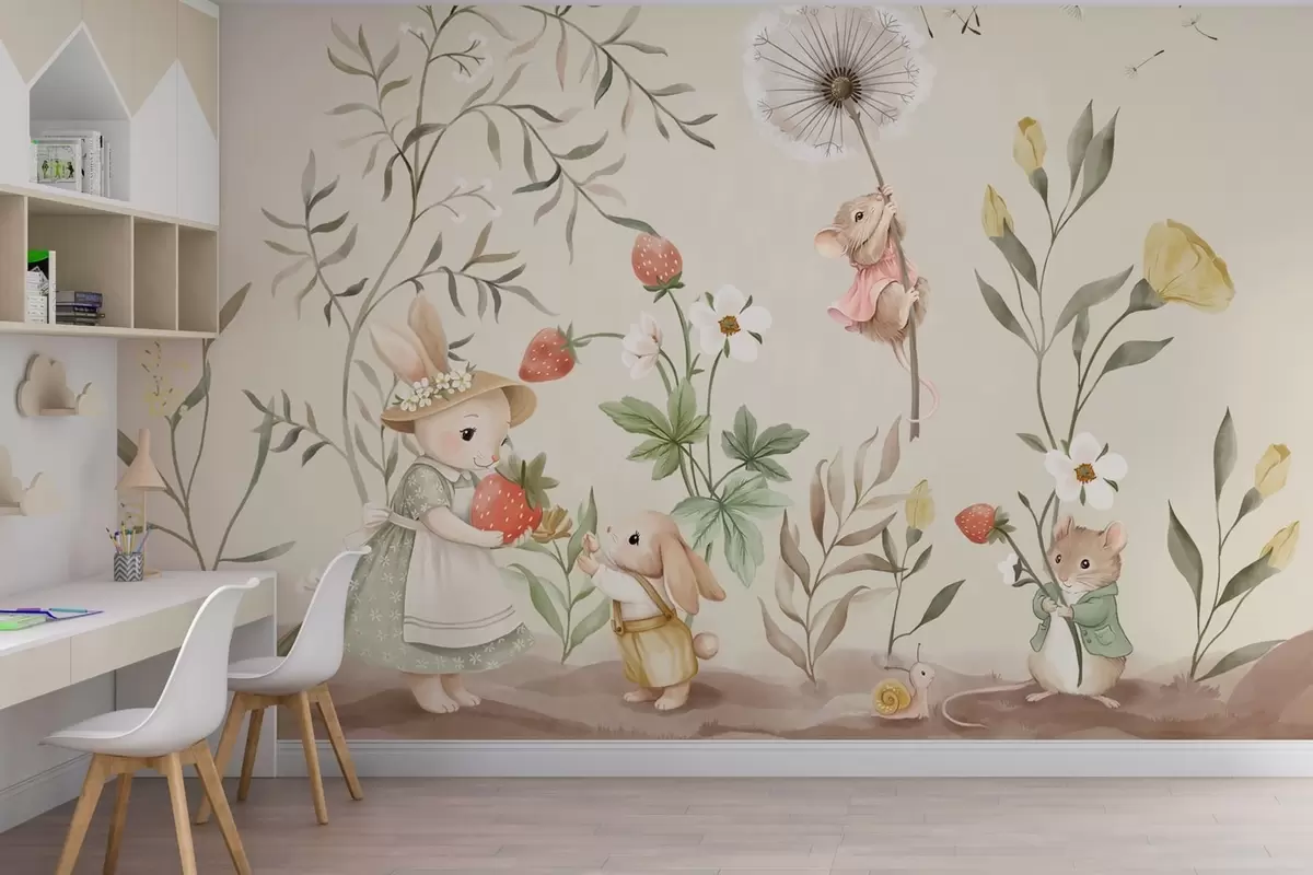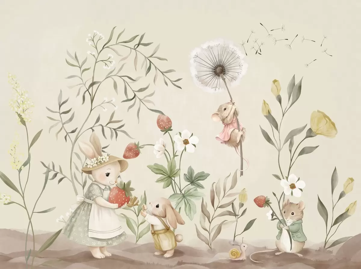 Fototapet Ilustrație cu un iepuraș, un șoricel și plante cu căpșuni Nr. w05422v2