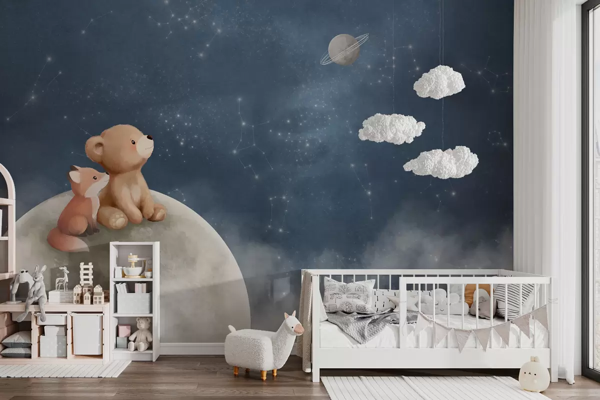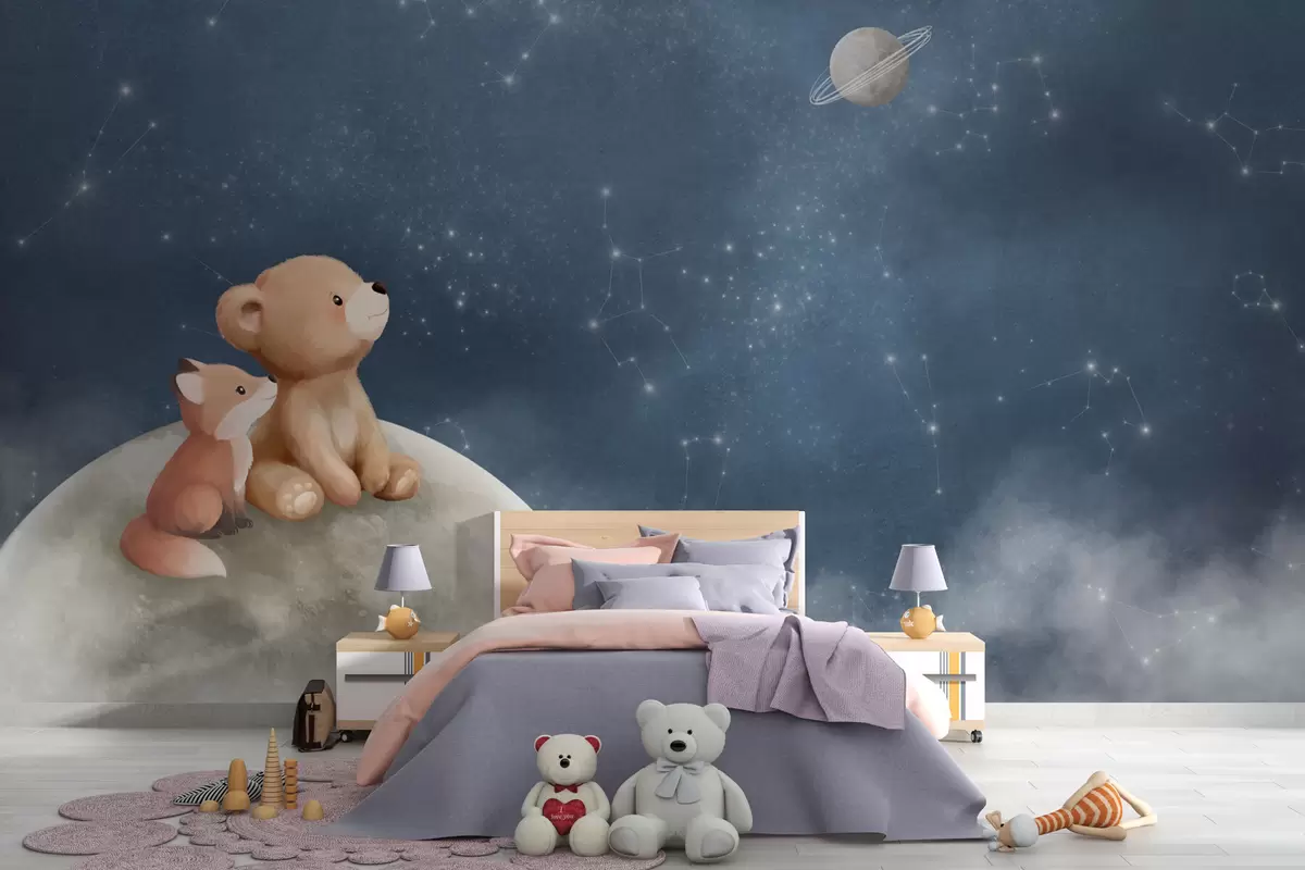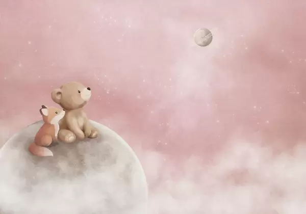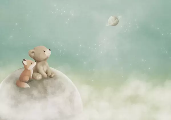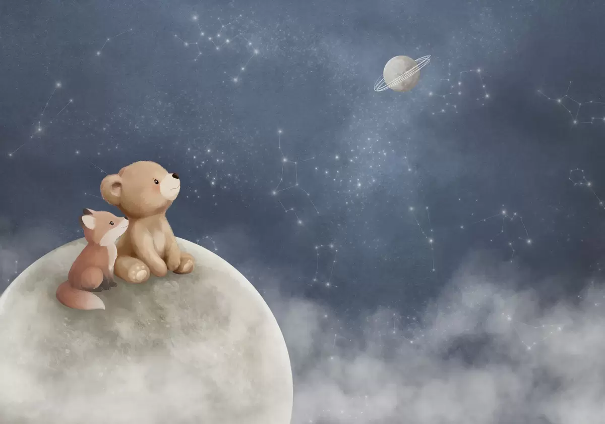 Fototapet Ilustrație în culori pastelate cu un urs și o vulpe pe fundalul cerului nocturn Nr. w05431