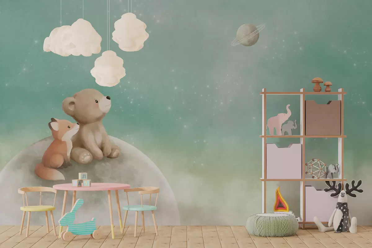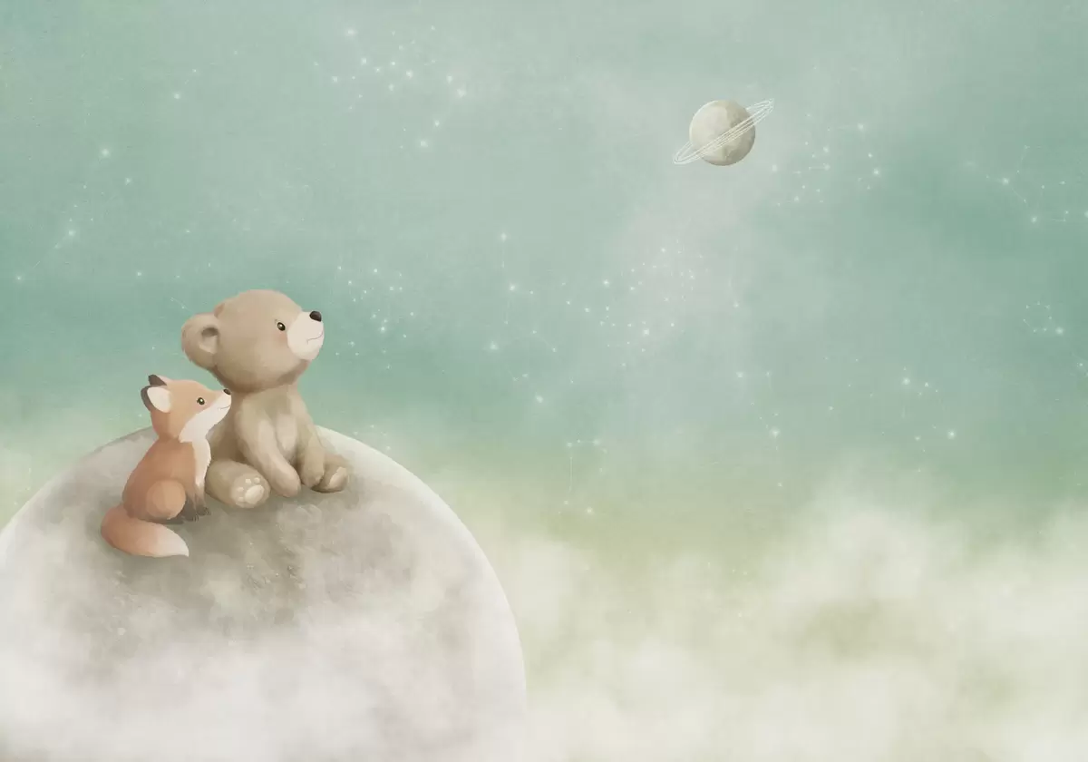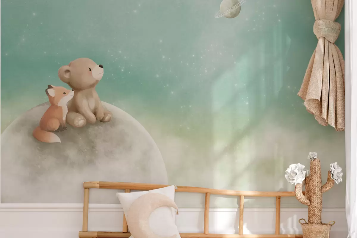 Fototapet Ilustrație în culori pastelate cu un urs și o vulpe pe fundalul unui cer verde Nr. w05431v1
