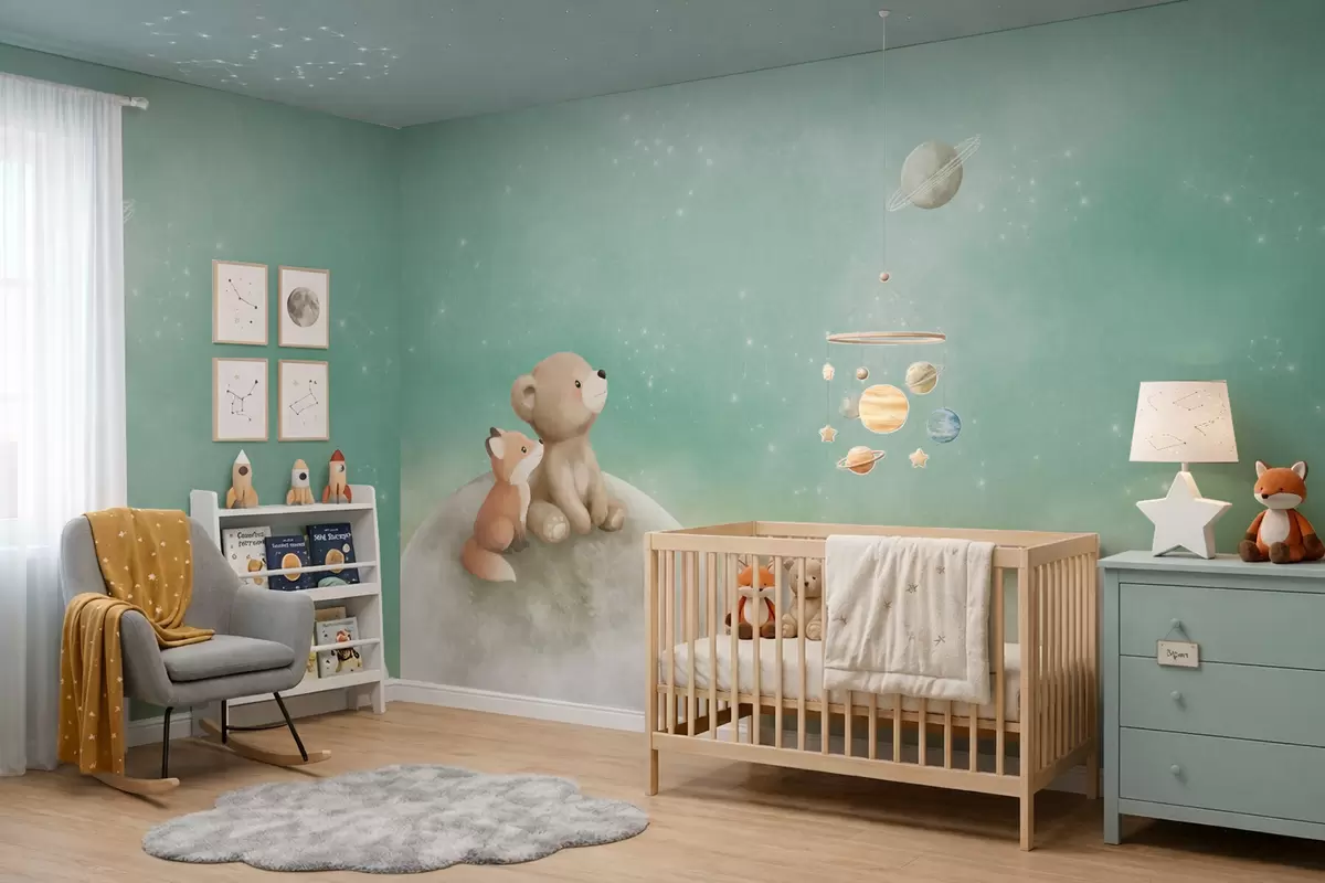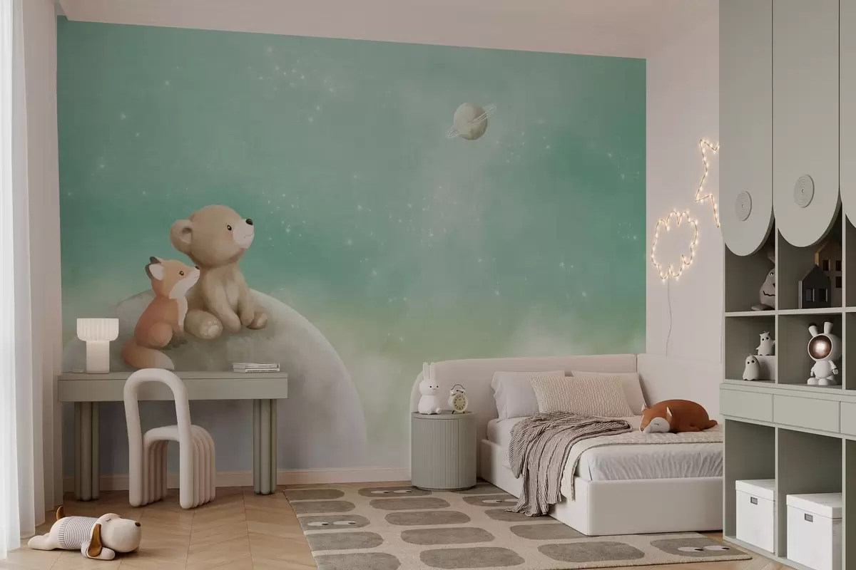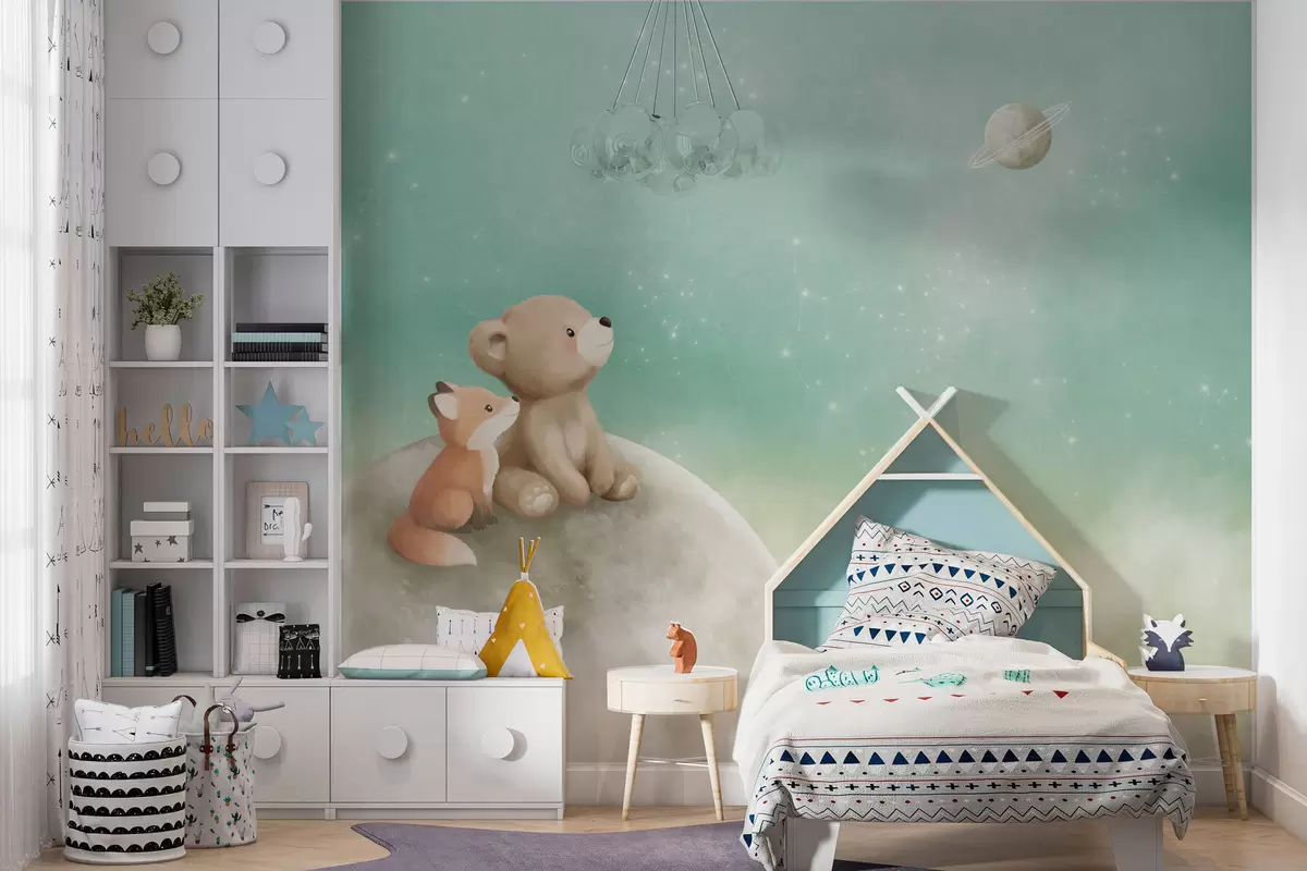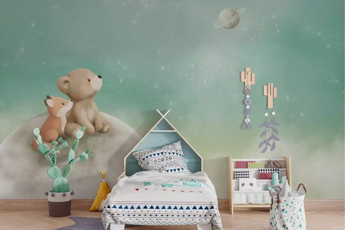 Fototapet Ilustrație în culori pastelate cu un urs și o vulpe pe fundalul unui cer verde Nr. w05431v1