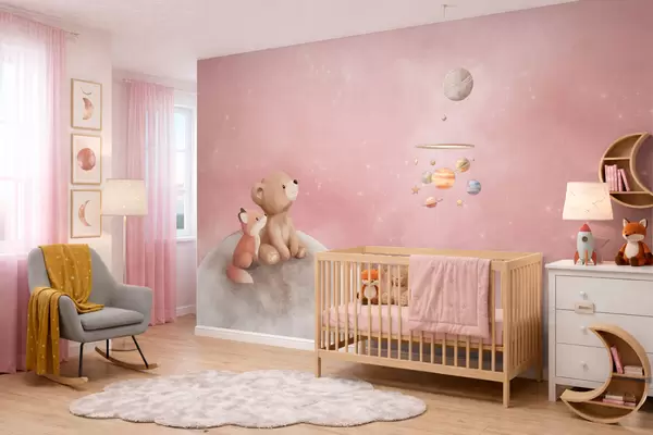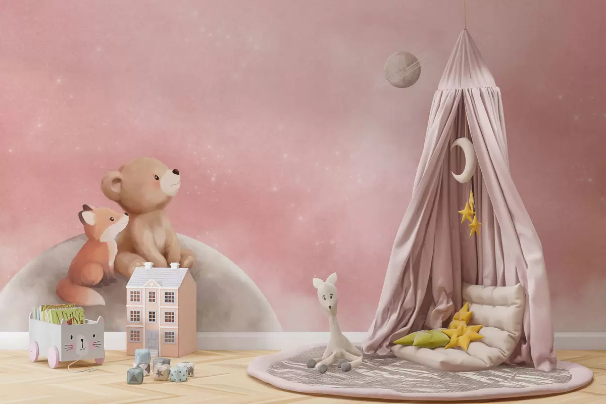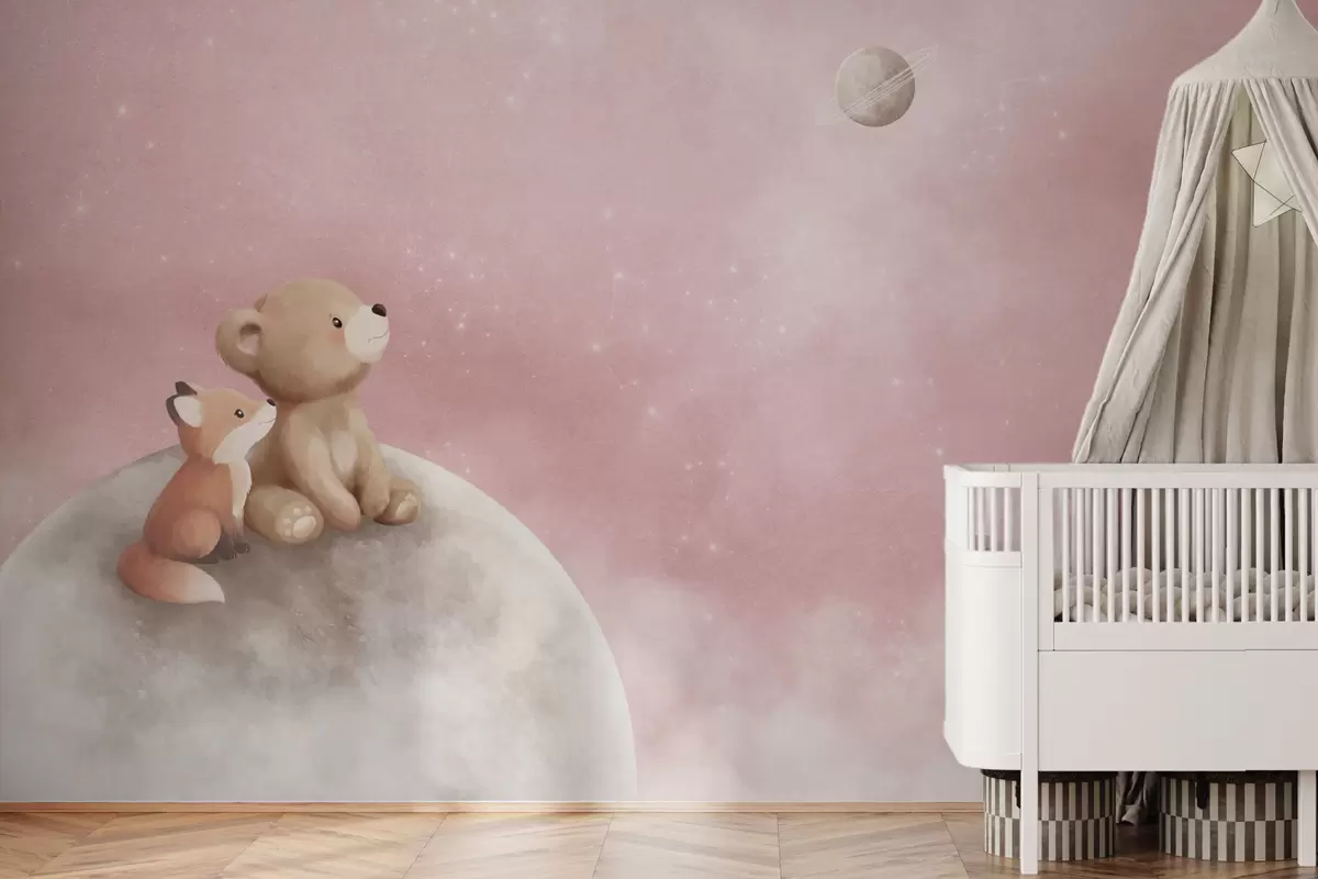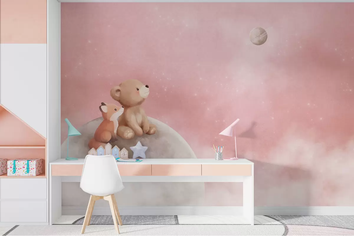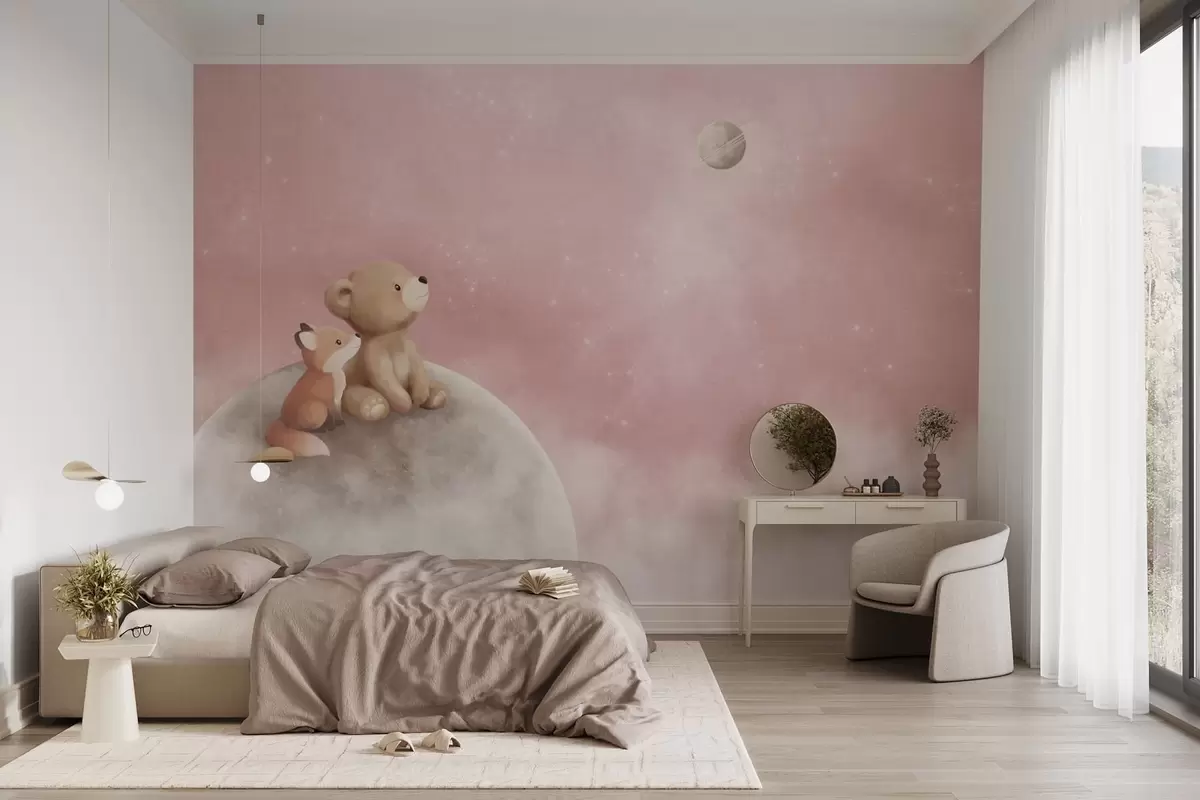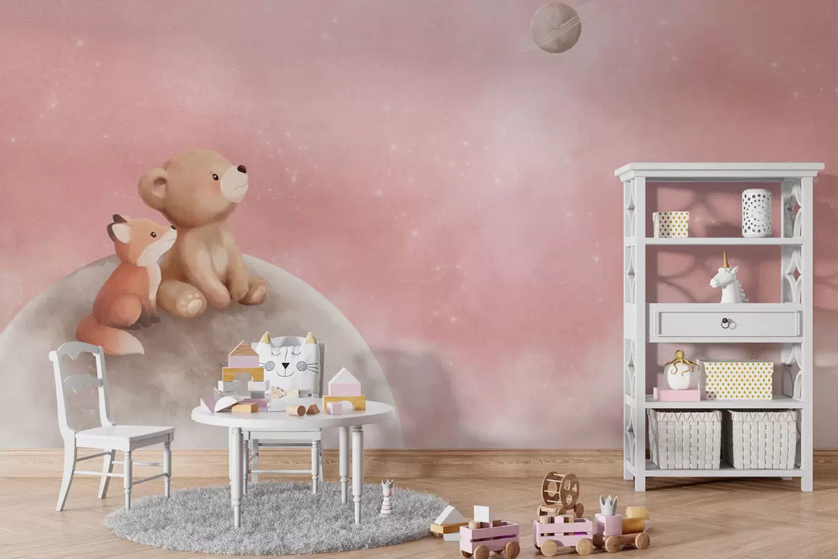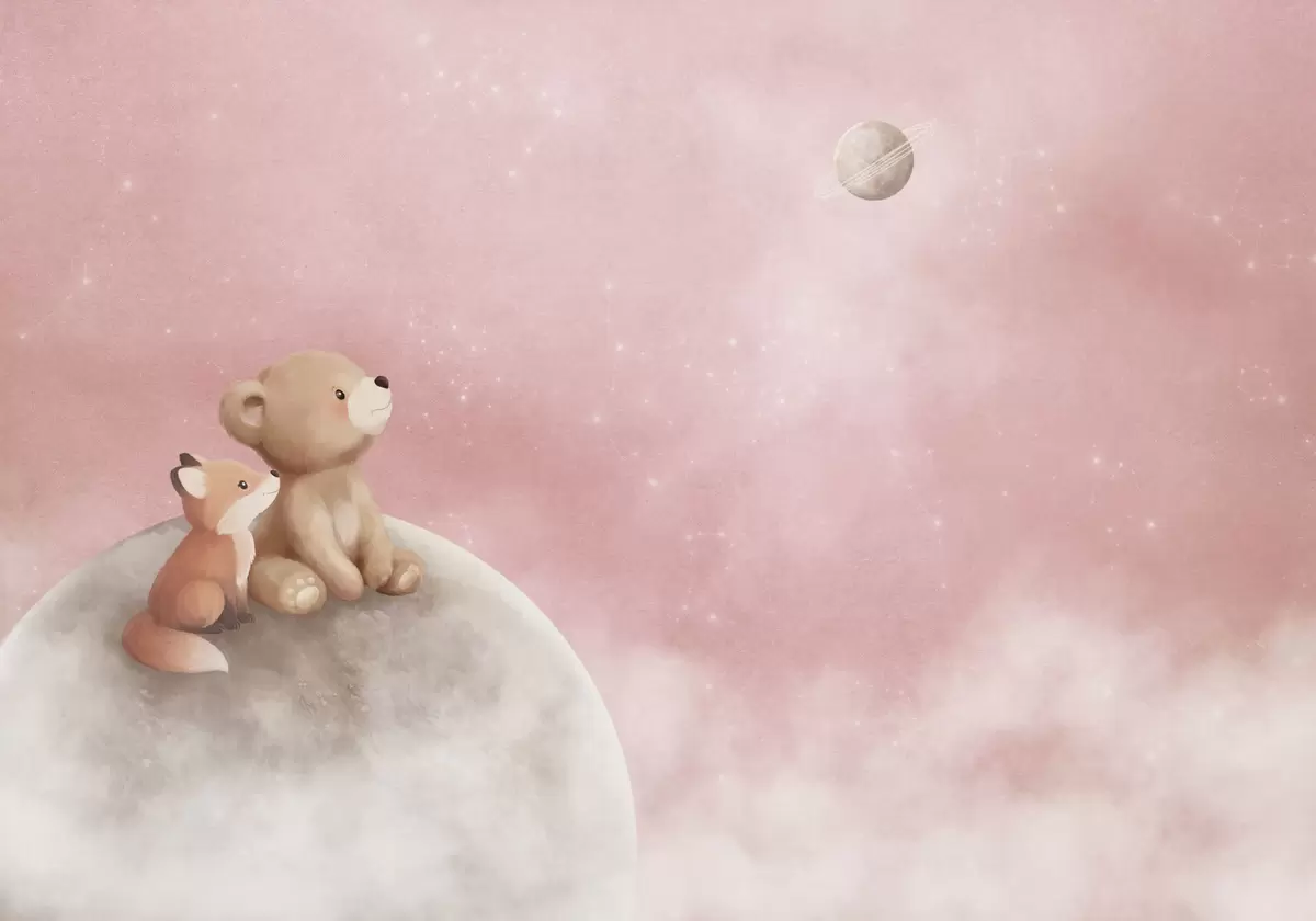 Fototapet Ilustrație în culori pastelate cu un urs și o vulpe pe fundalul unui cer roz, sub lumina lunii Nr. w05431v2