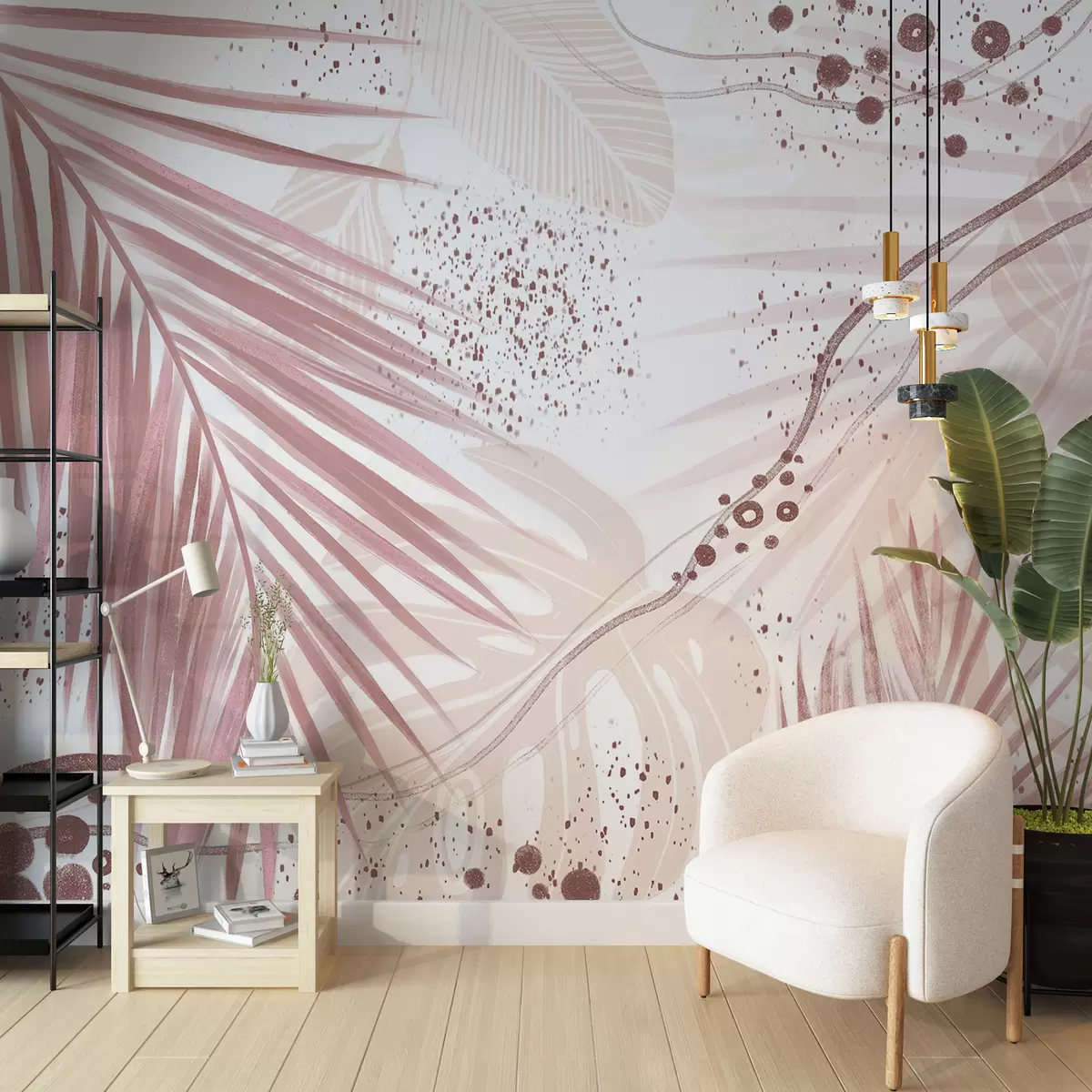 Fototapet Frunze și frunze de palmier roz tropical, cu forme abstracte și stropi în nuanțe de roz și alb Nr. w07918v1