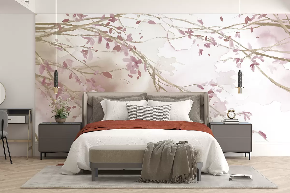 Fototapet Delicate ramuri florale roz și alb cu fundal de acuarelă moale, estompat Nr. w07919v1