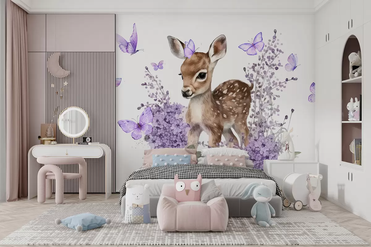 Fototapet O căprioară tânără cu ochi mari și blană pătată, înconjurată de flori mov și fluturi Nr. w07931