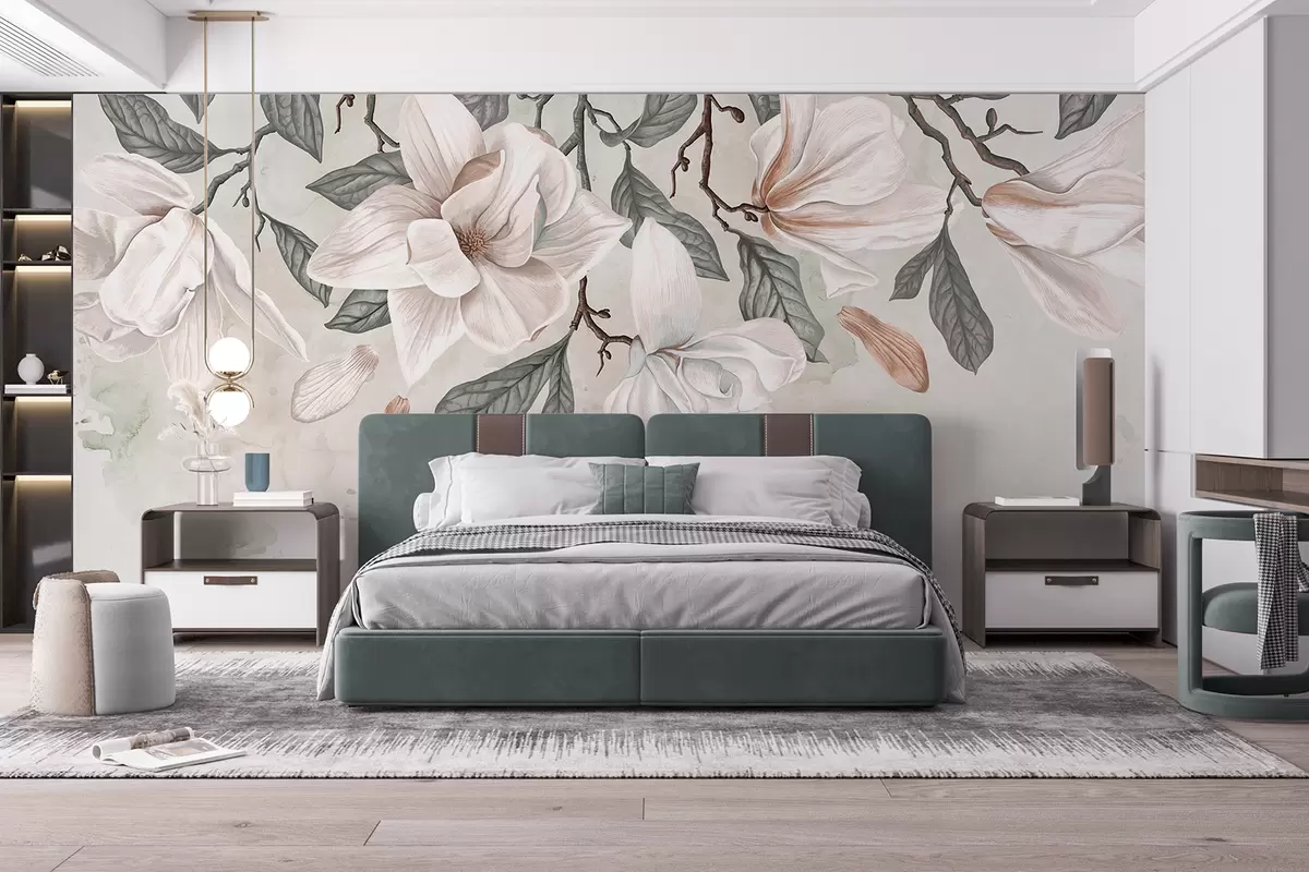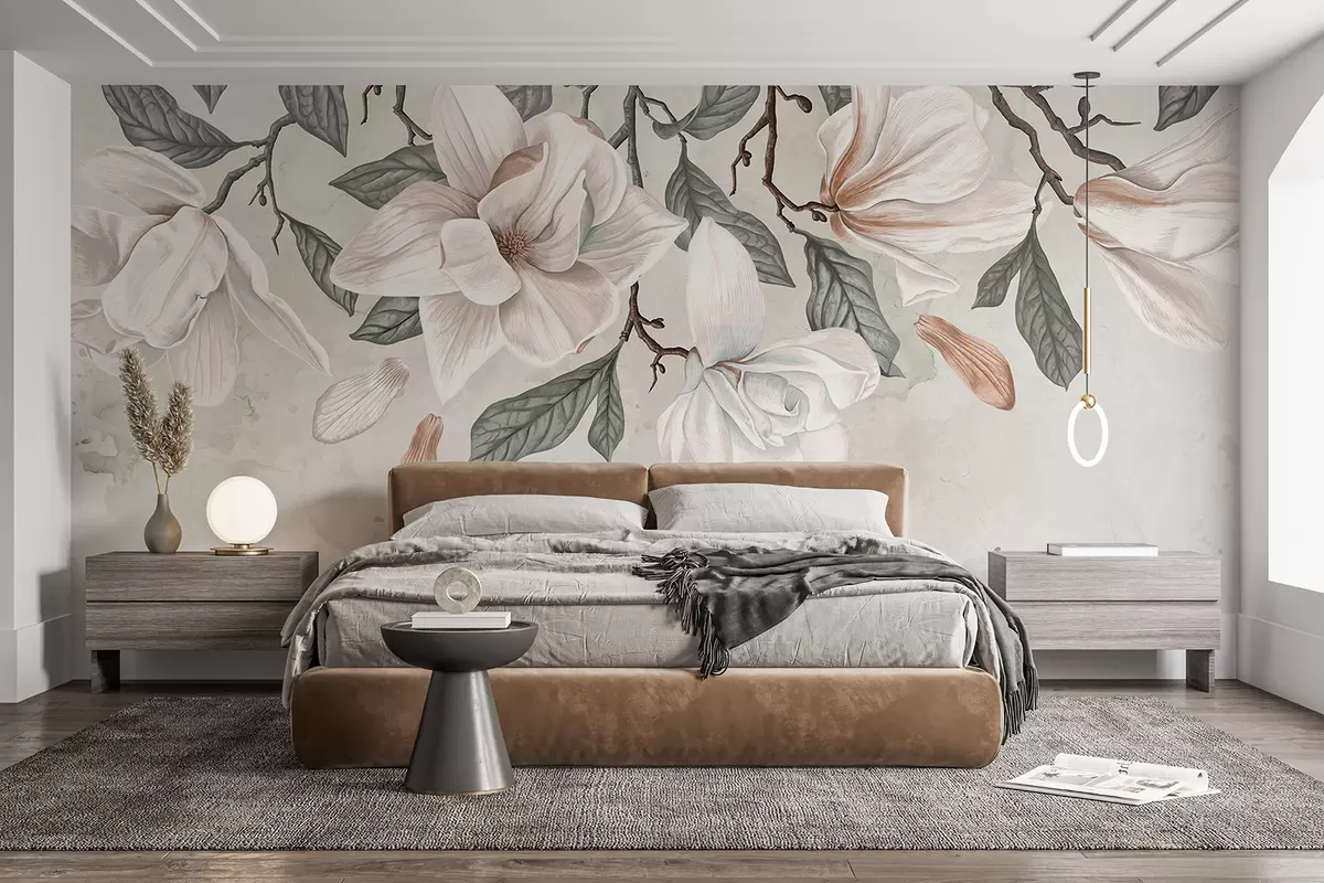 Fototapet Flori delicate de magnolie roz și albe cu frunze verzi pe un fundal deschis, o compoziție florală moale Nr. w07977