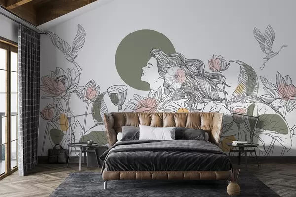 Fototapet Femeie în natură, desen liniar, flori de lotus, frunze mari, păsări zburătoare, culori pastelate Nr. w07988v6