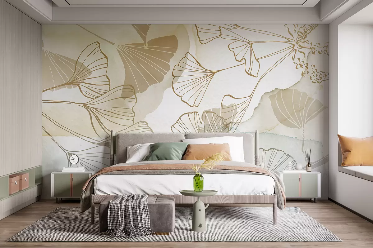 Fototapet Un model de frunze delicate de ginkgo în nuanțe de bej, bronz și albastru pe un fundal deschis Nr. w08157