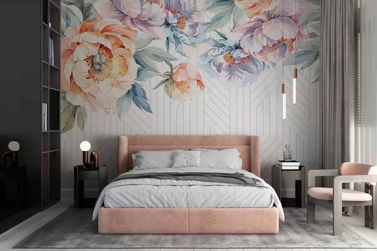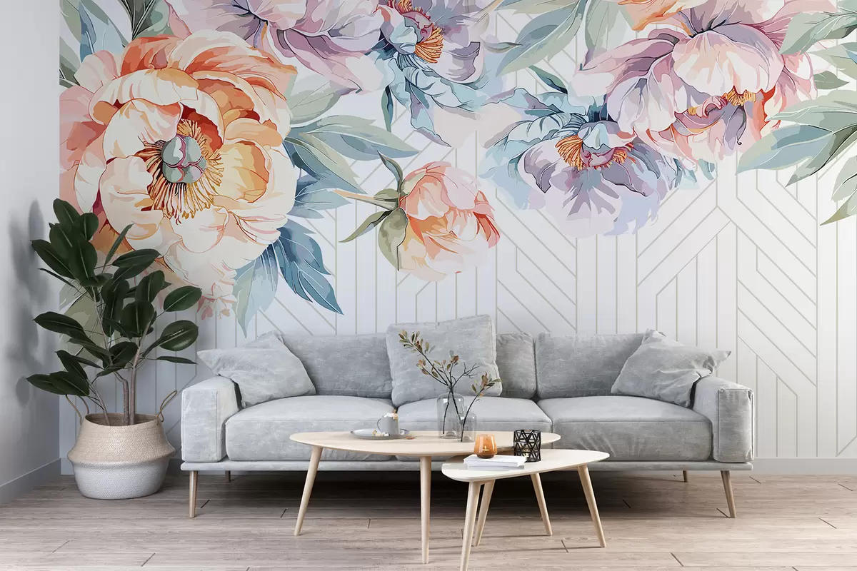 Fototapet Peonii abstracte vibrante piersici și roz cu frunze verzi pe un fundal alb și gri model Nr. w08183
