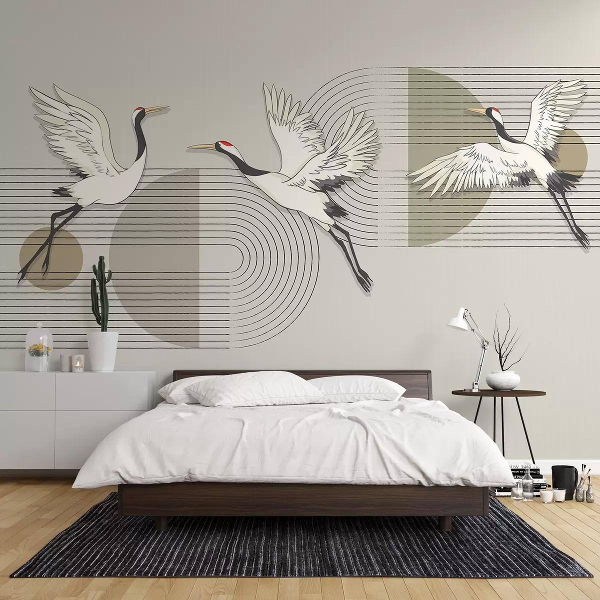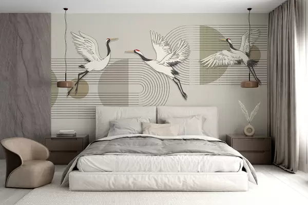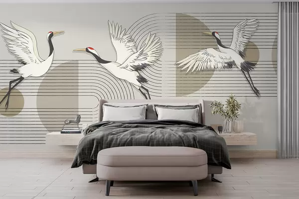 Fototapet Trei cocori albi în zbor pe un fundal geometric minimalist cu cercuri concentrice Nr. w08188