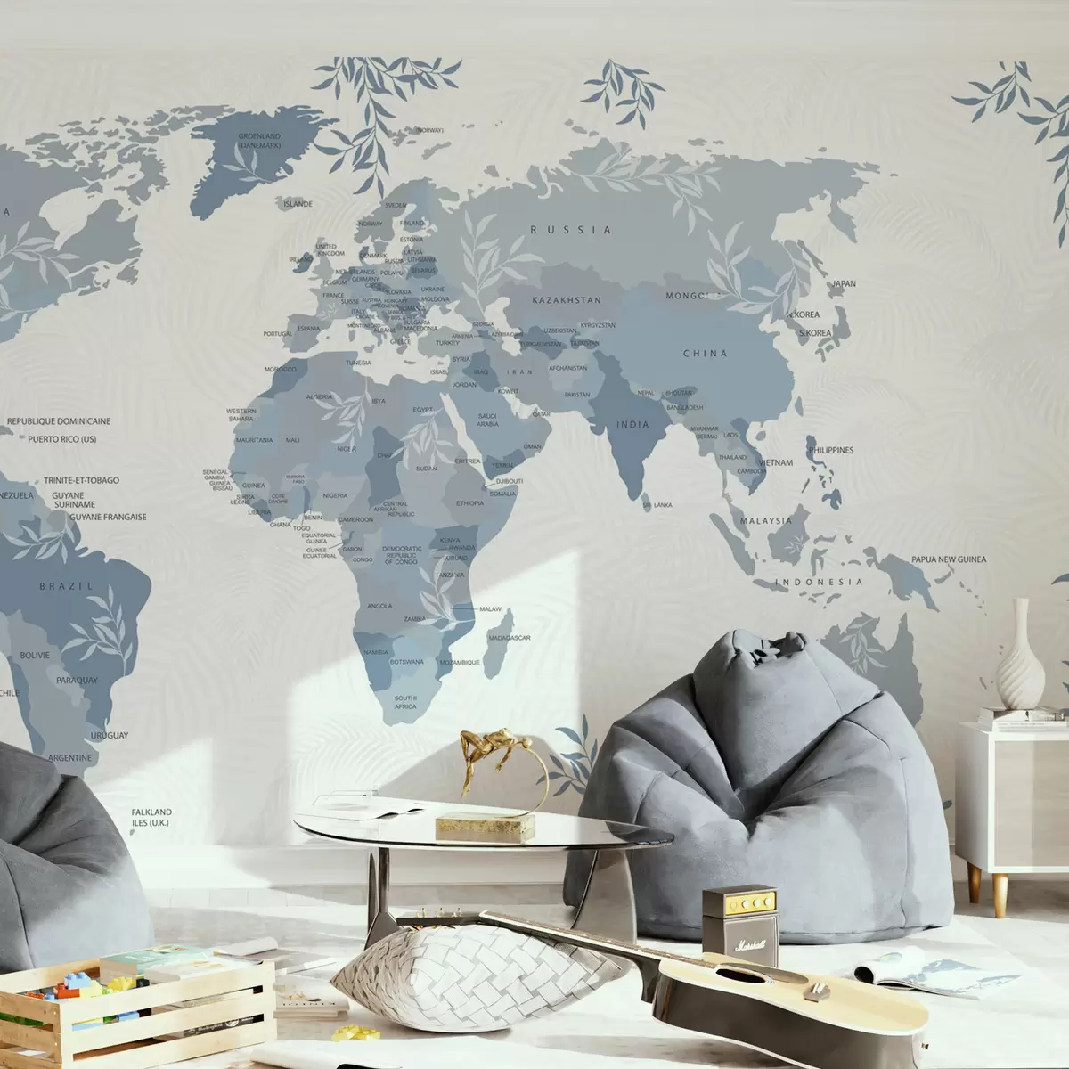 Fototapet Hartă mondială elegantă cu frunze și plante de culoare albastră Nr. w08211v4