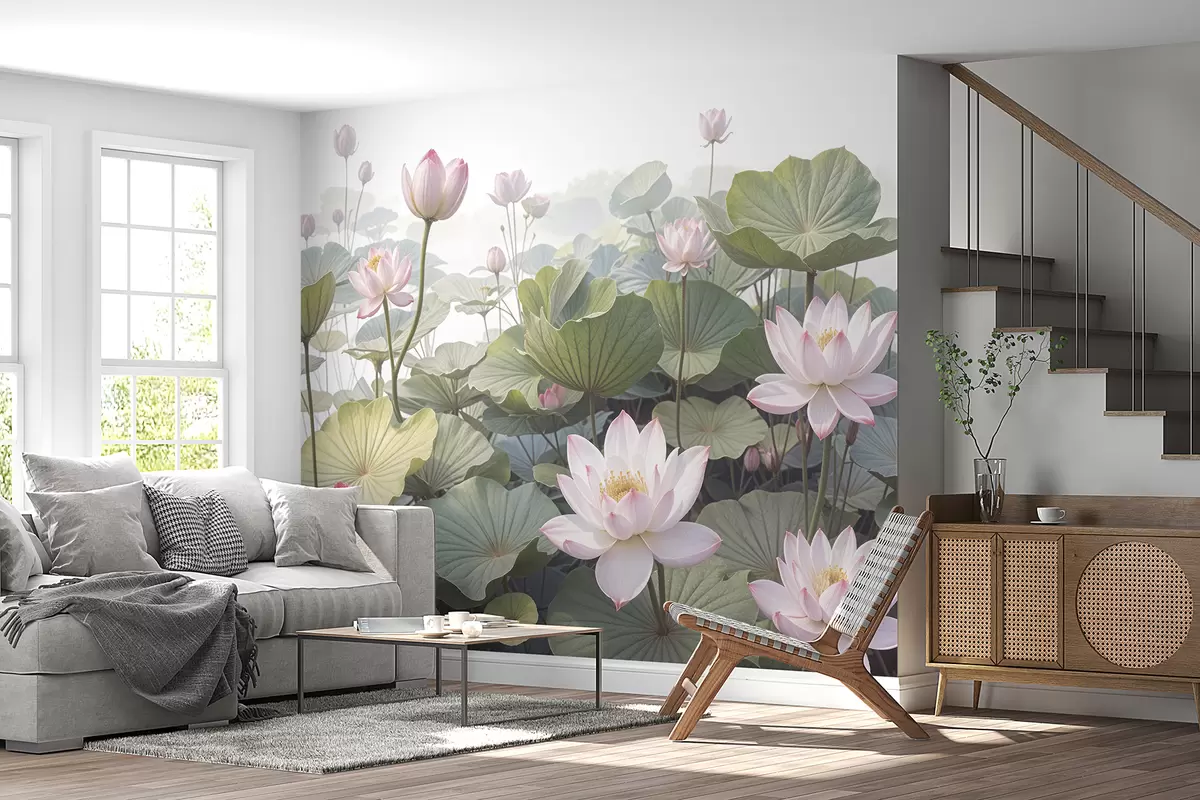 Fototapet Flori de lotus roz și albe cu frunze verzi mari, înconjurate de un fundal cețos, atmosferic Nr. w08221