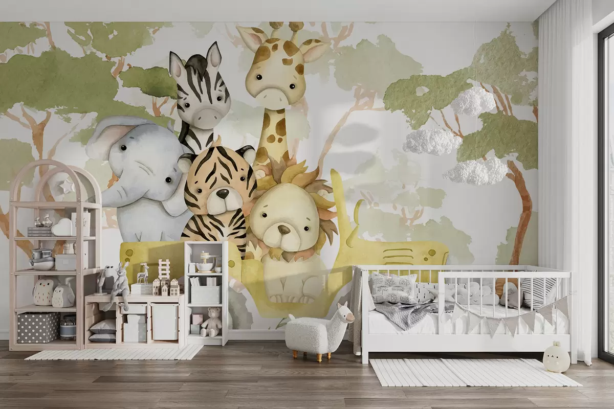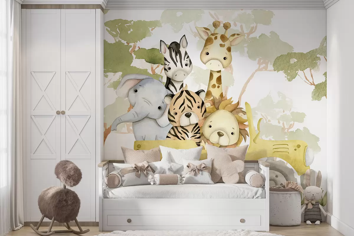 Fototapet Un camion de jucărie galben care transportă o girafă, un tigru, un iepure și un elefant, pe un fundal de frunziș verde Nr. w08233