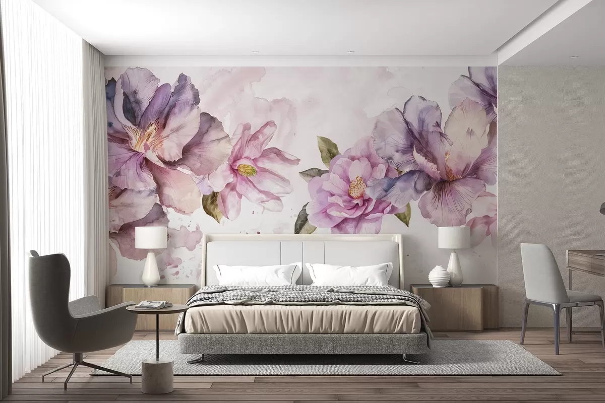 Fototapet Flori delicate de acuarelă roz și violet cu petale moi și frunze verzi pe un fundal deschis Nr. w08238