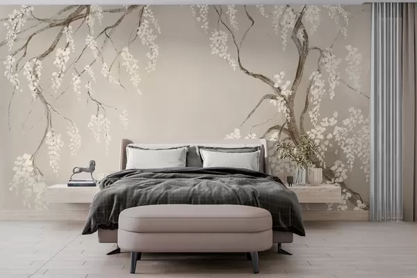Fototapet Cireș alb delicat cu flori înflorite pe ramuri pe fundal bej Nr. w08243