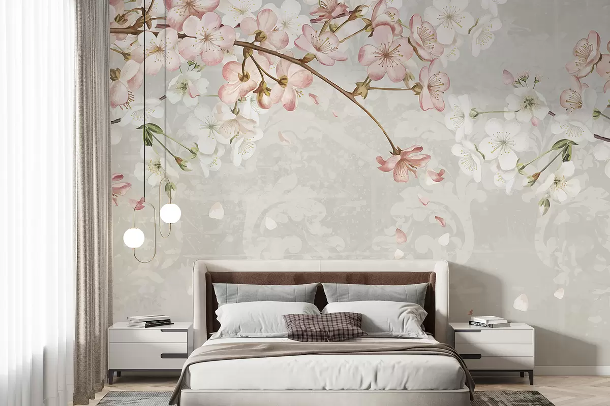 Fototapet Flori de cireș roz și alb în plină înflorire, cu petale moi care cad pe un fundal bej texturat Nr. w08254v1
