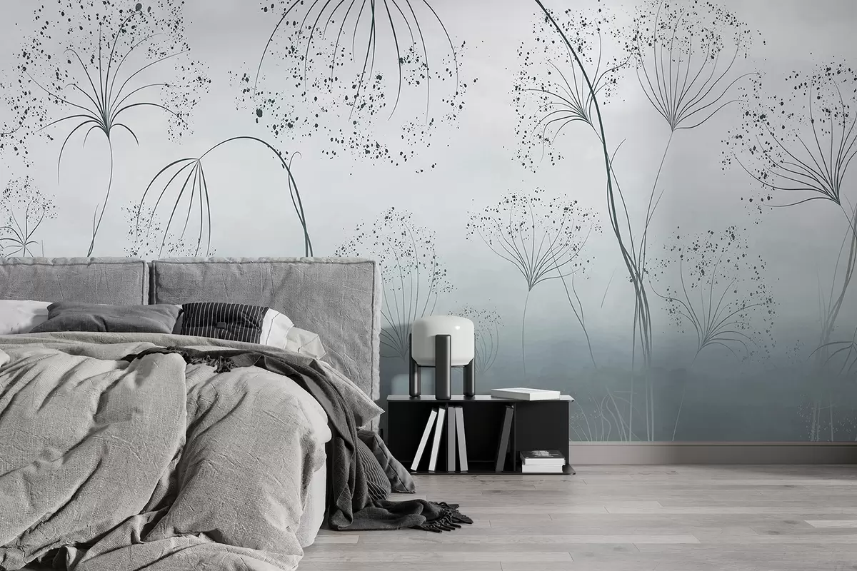 Fototapet Plante albastre, înalte și rarefiate, cu flori delicate, în formă de umbrelă sau capete de semințe, într-un mediu cețos, atmosferic Nr. w08258v1