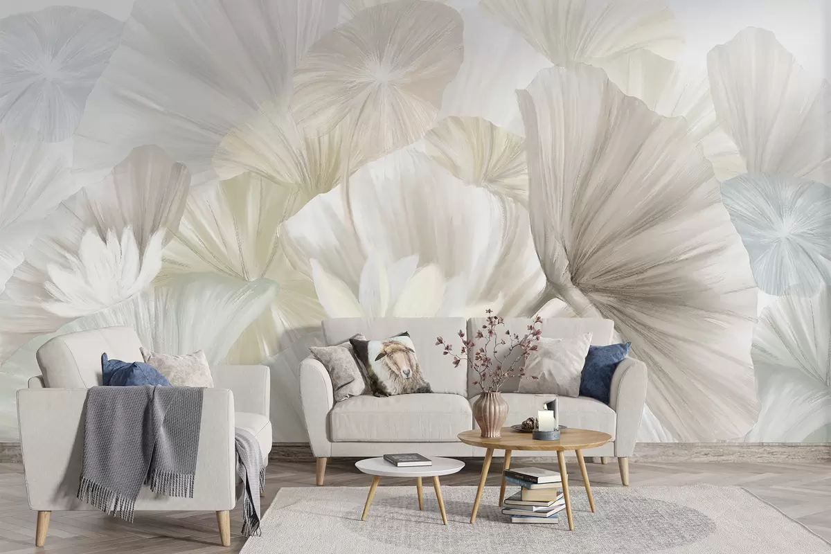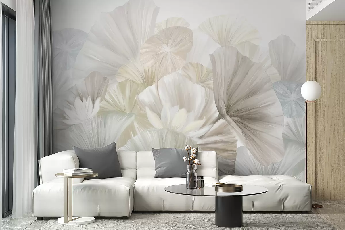 Fototapet Frunze delicate de lotus verde cu flori albe cu petale moi, cu pene, aranjate într-o compoziție artistică naturală Nr. w08265