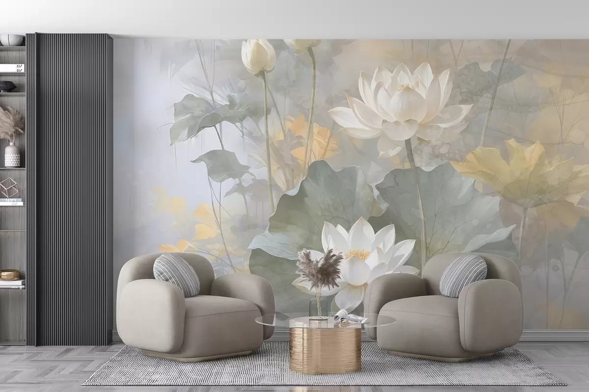 Fototapet Flori albe de lotus cu frunze într-un iaz cu un fundal moale, blurat galben și verde Nr. w08275