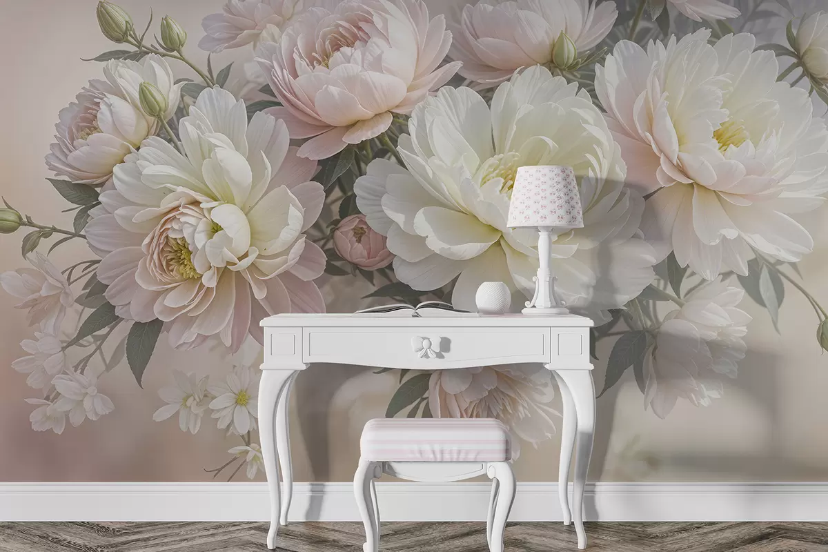 Fototapet Un buchet de bujori și alte flori luxuriante, în culori pastelate, pe un fundal blând, neclar Nr. w08276