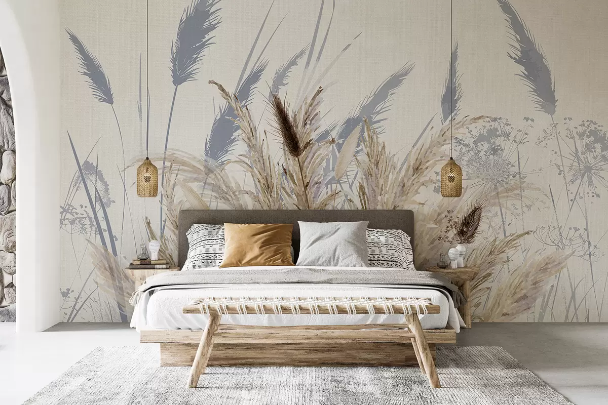 Fototapet Tulpini înalte de grâu și iarbă cu pene albe pufoase pe un fundal deschis Nr. w08282
