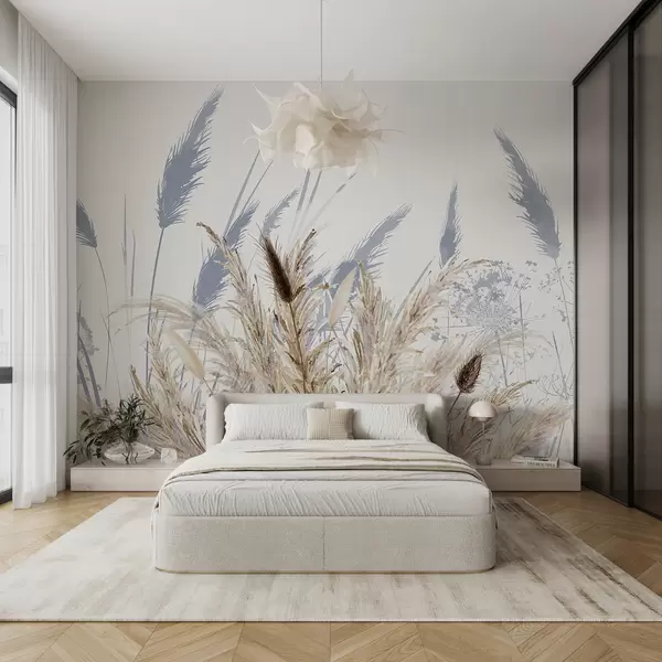 Fototapet Tulpini înalte de grâu și iarbă cu pene albe pufoase pe un fundal deschis Nr. w08282