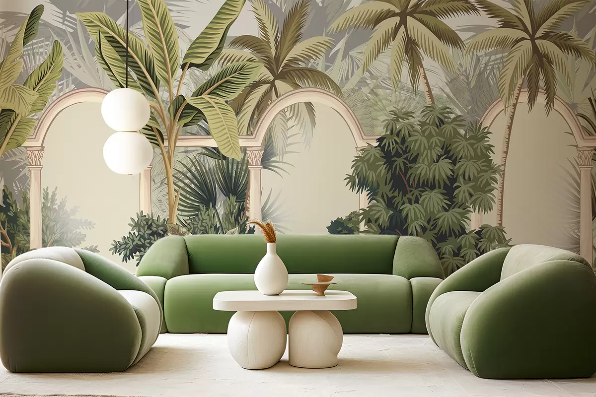 Fototapet Arce cu peisaj tropical, palmieri luxurianți și alte frunze pe un fundal deschis Nr. w08306