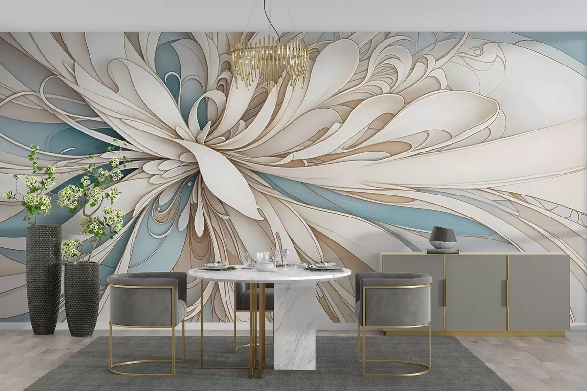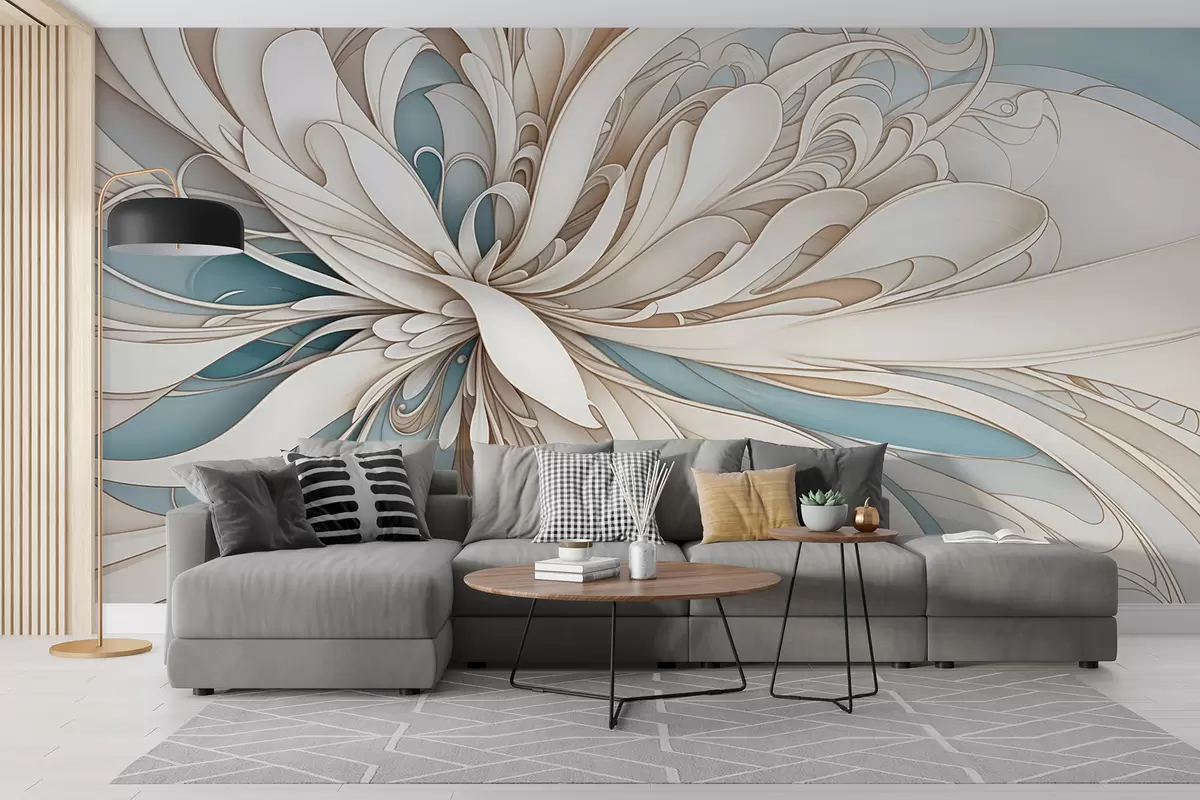 Fototapet Model floral abstract cu forme organice învârtite în nuanțe de bej, cafeniu și albastru pe un fundal deschis Nr. w08311