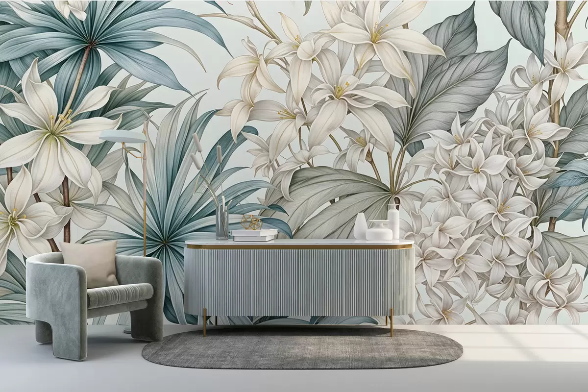 Fototapet Un imprimeu floral tropical cu flori mari albe și albastru deschis, frunze verzi și un fundal neutru Nr. w08318