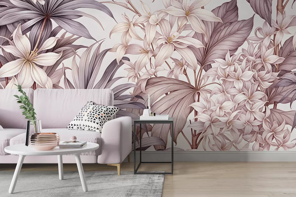 Fototapet Un imprimeu floral tropical cu flori mari albe și roz deschis, frunze bordo și un fundal neutru Nr. w08318v1
