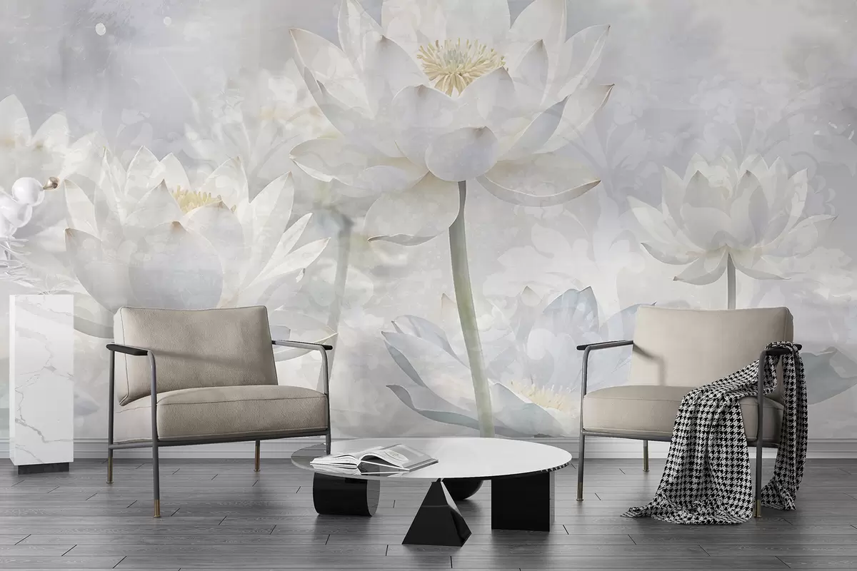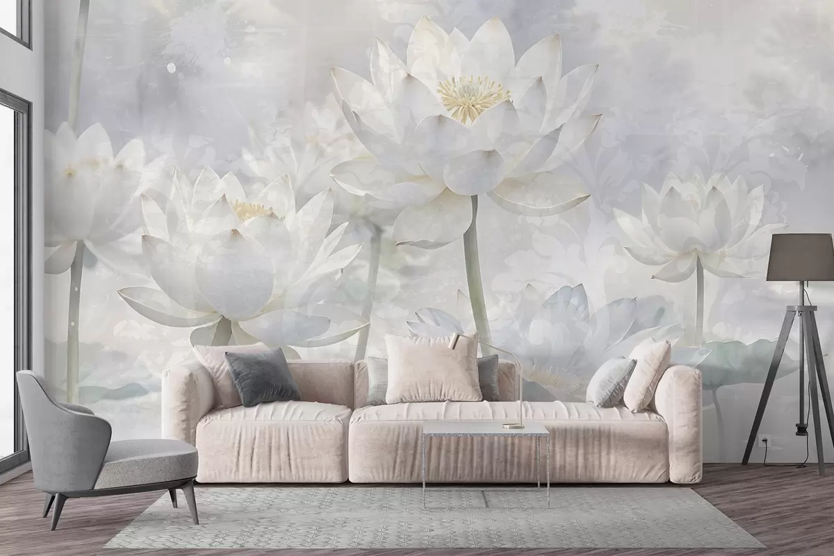 Fototapet Flori albe de lotus într-un fundal cețos, eteric abstract pastel peisaj Nr. w08328