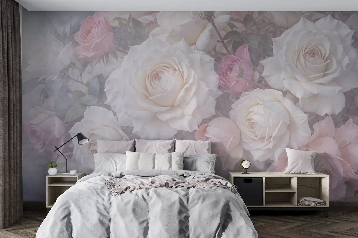 Fototapet Trandafiri și bujori moi, în culori pastelate, pe un fundal neclar, cu textură gri cețos Nr. w08352