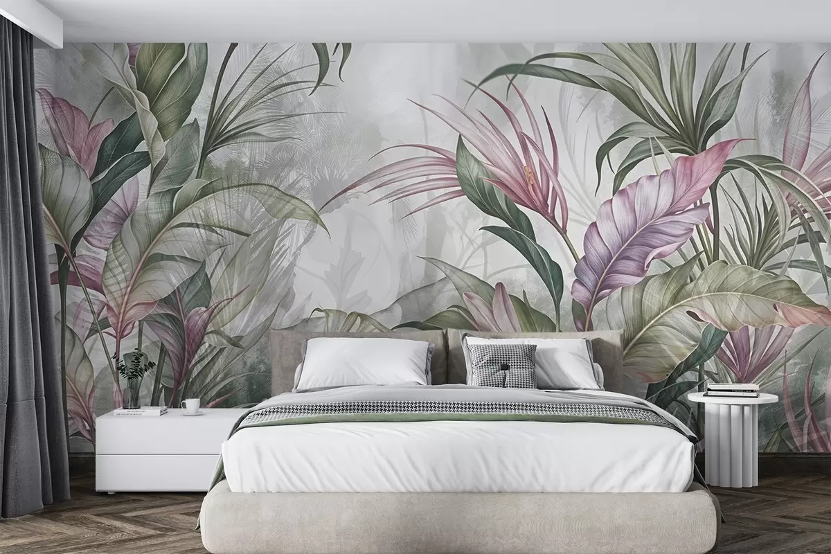 Fototapet Junglă tropicală cu frunze verzi mari și flori protea roz cu fundal cu textură estompată Nr. w08375