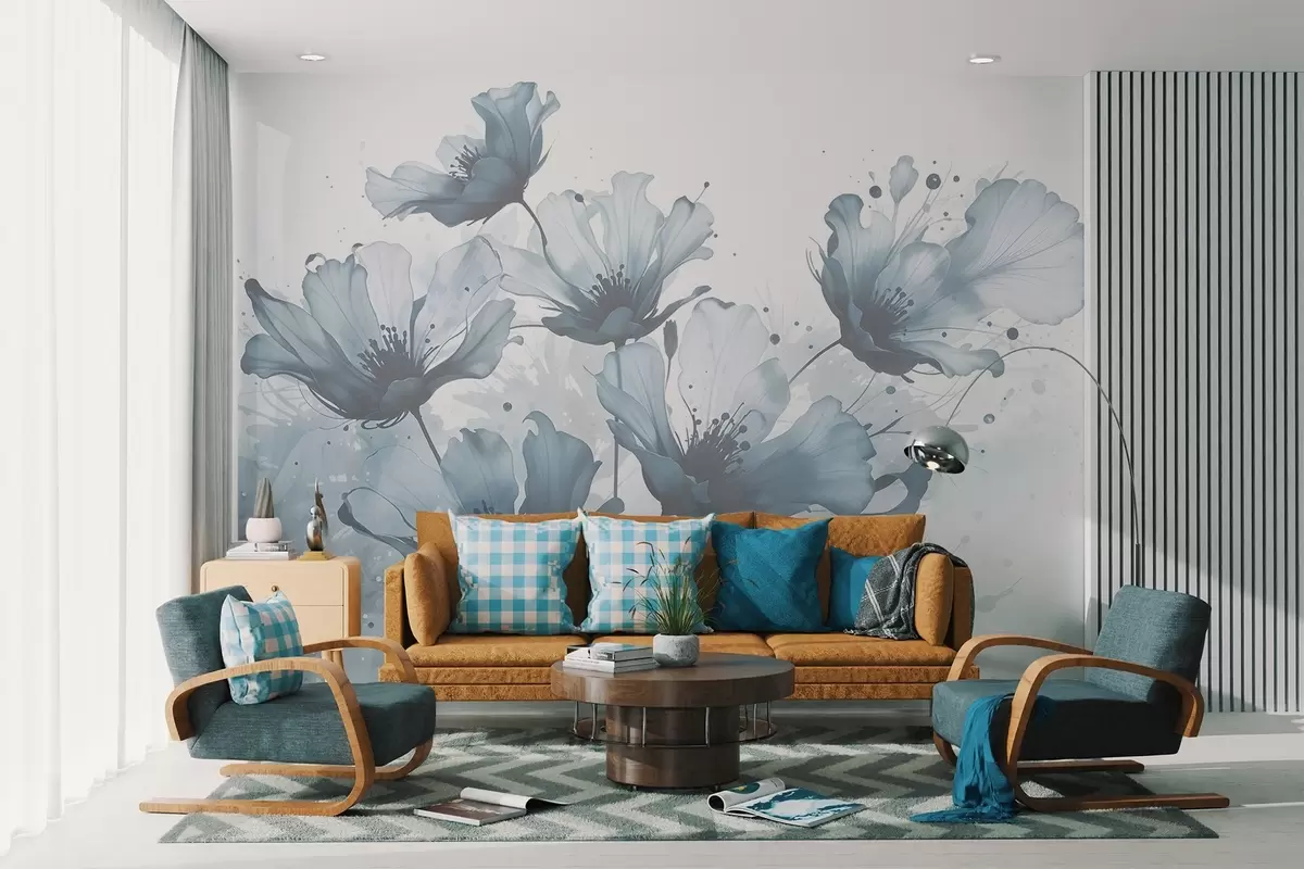 Fototapet Delicate flori albastre cu petale moi, neclare și stropi de acuarelă pe un fundal deschis Nr. w08376