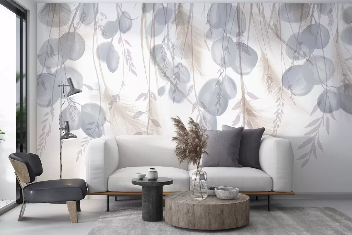 Fototapet Frunzele delicate de eucalipt albastru și bej pastel cad, creând o atmosferă senină și liniștitoare Nr. w08380v1