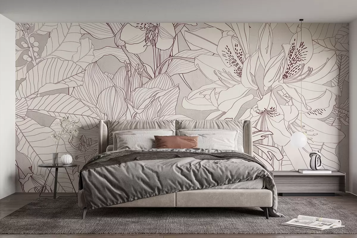 Fototapet Imprimeu floral detaliat bordo și gri cu diferite tipuri de flori și frunze, un design botanic luxuriant și complex Nr. w08385