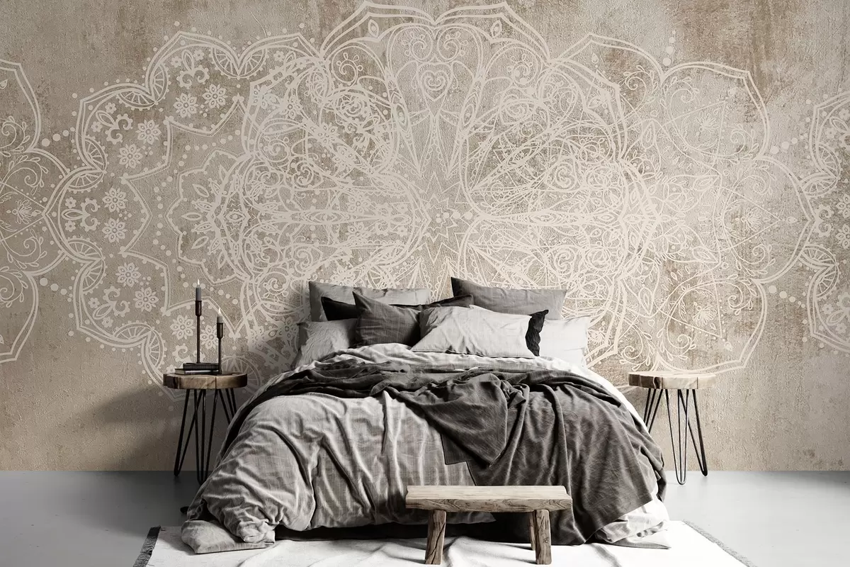 Fototapet Un model detaliat, complicat de dantelă albă mandala pe un fundal texturat de perete bej-maro loft Nr. w08387v1