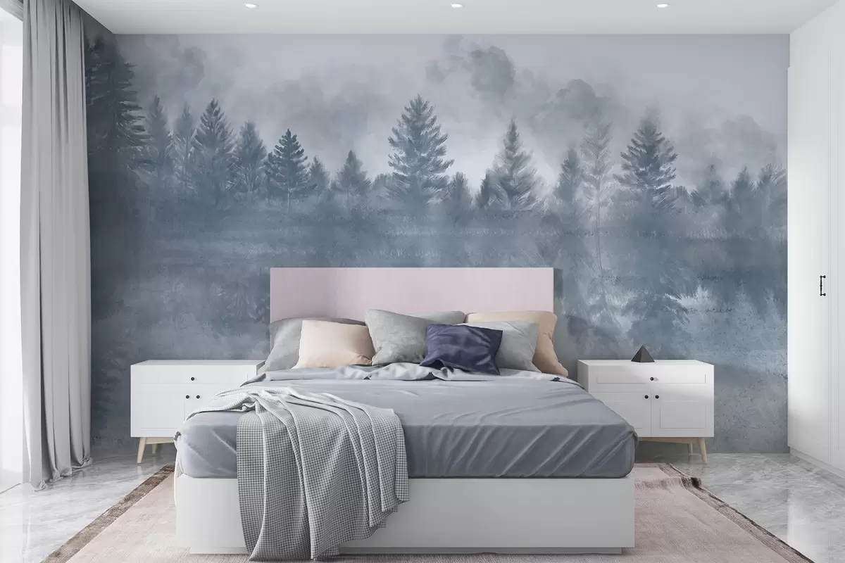 Fototapet Un peisaj senin cu un lac înghețat înconjurat de o pădure densă de pini, cu o atmosferă încețoșată, cețoasă Nr. w08415
